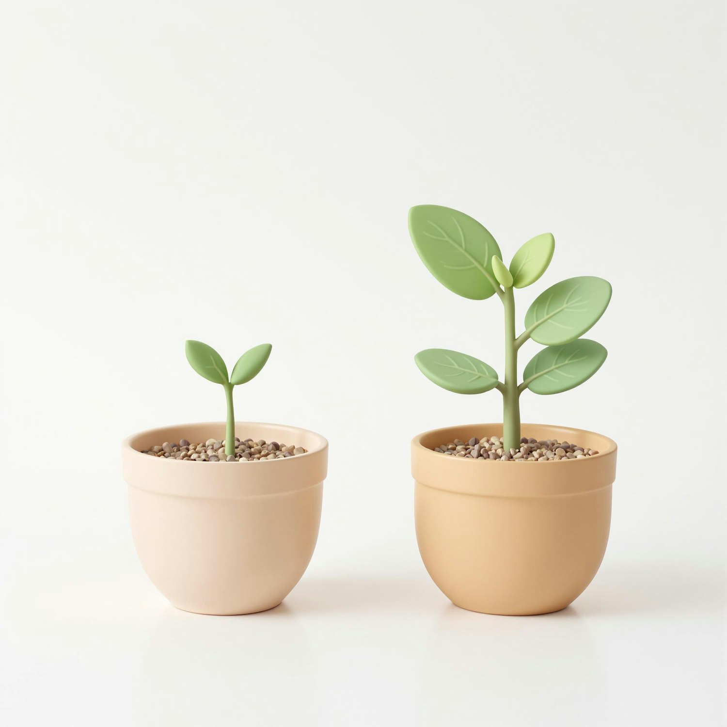 Minimalist potted plants side by side, showcasing growth with a small sprout and a larger plant in beige pots on a white background.