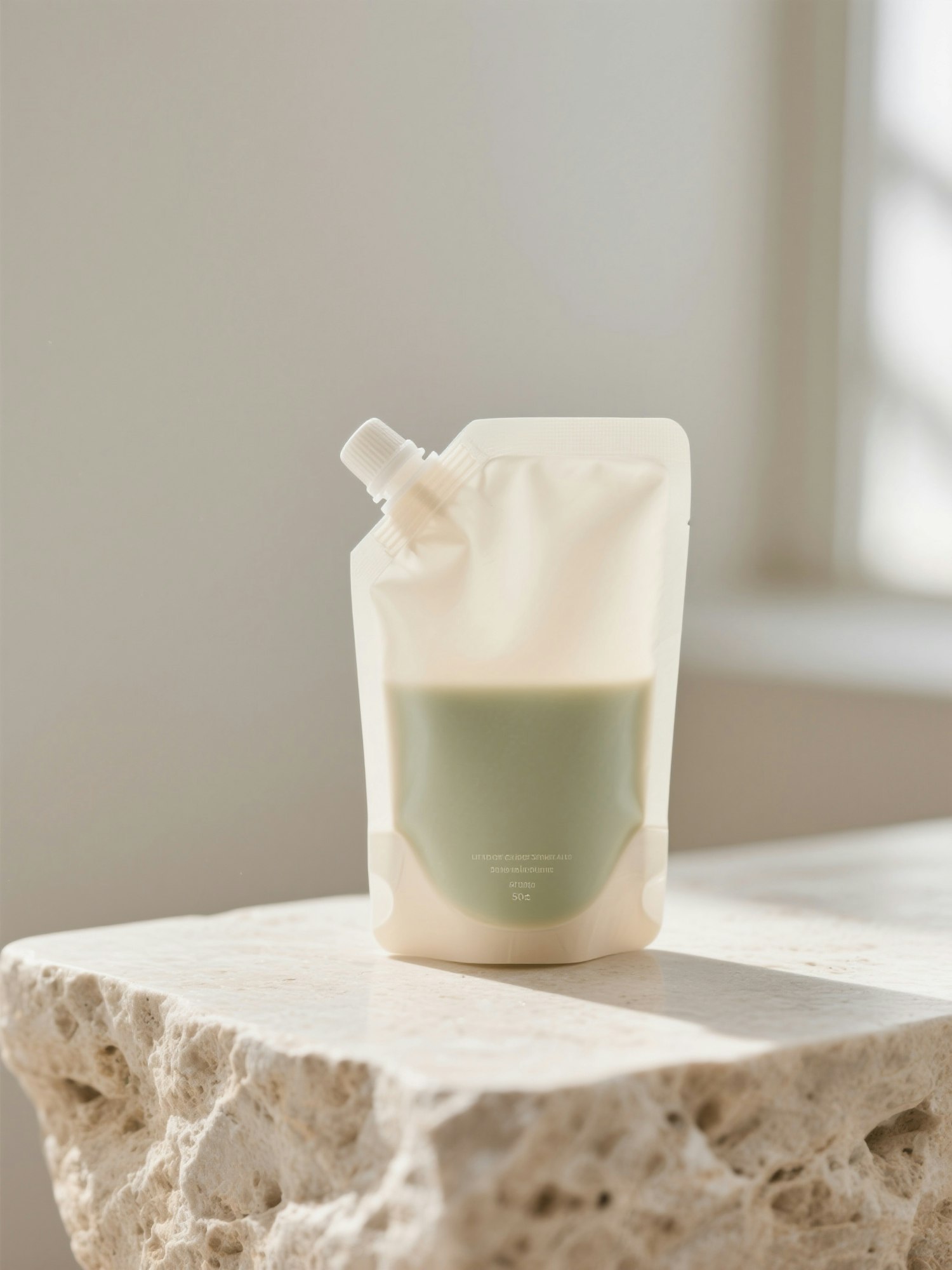 product photo of a soft refill pouch for skincare, standing upright on a travertine stone surface, made of semi-matte recyclable material with a visible pouring spout — photographed in soft daylight with natural shadows, no label or branding, in beige and pale olive gradient tones, clean minimal aesthetic consistent with sustainable luxury packaging