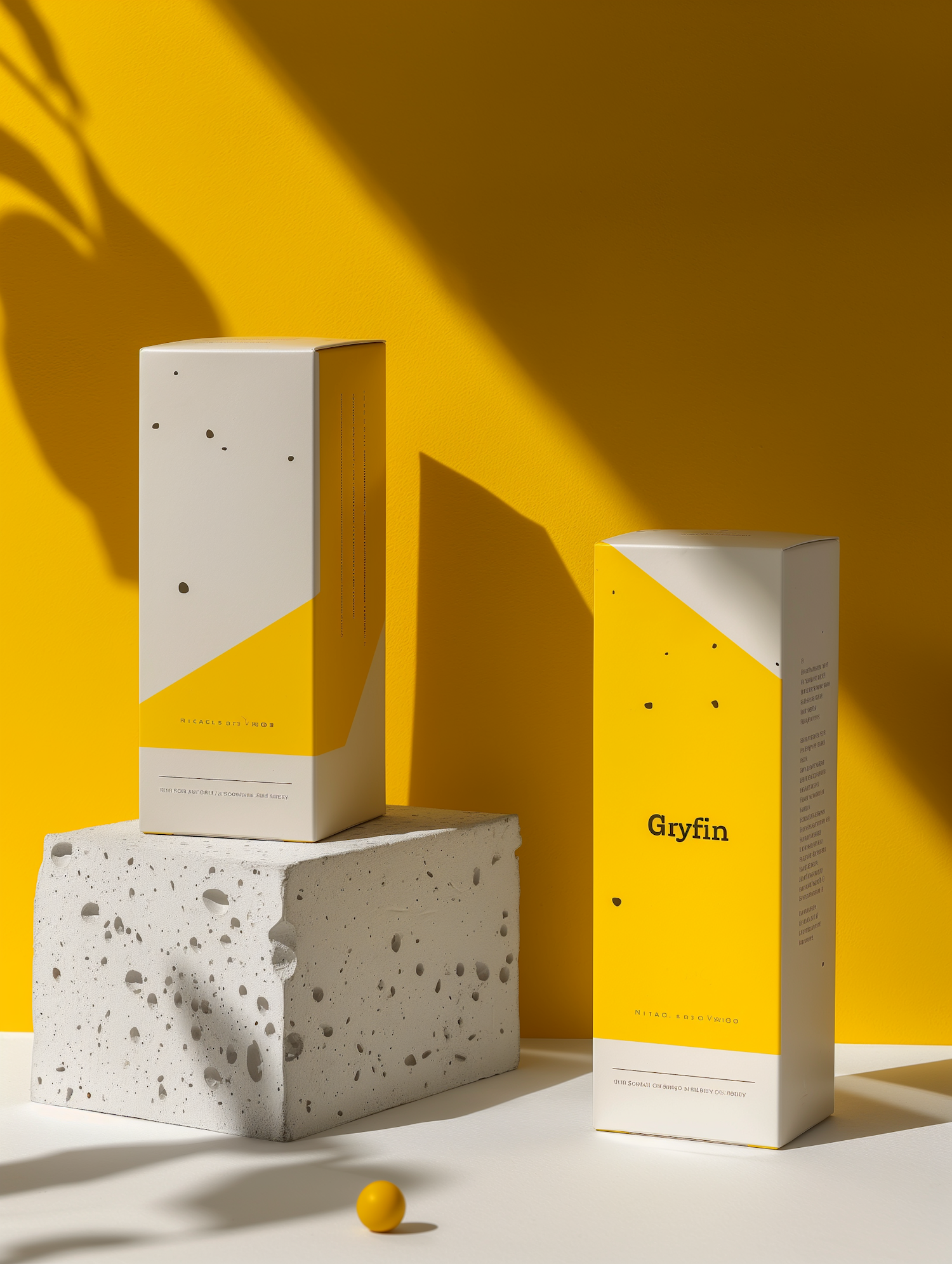 Minimalist packaging design with bold yellow accents and concrete block, featuring 'Gryfin' branding.