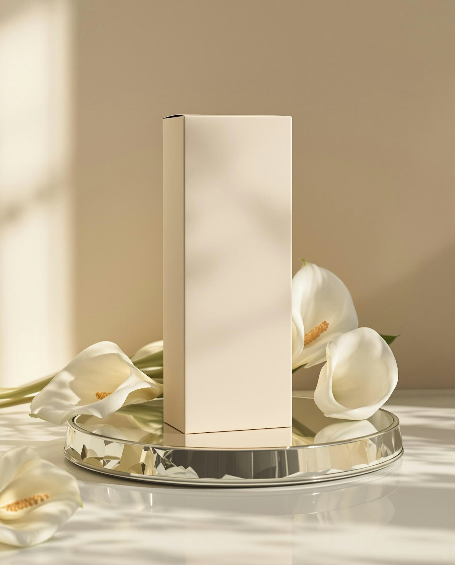 Minimalist product display with a beige box, white lilies, and a mirror base in a soft beige setting.