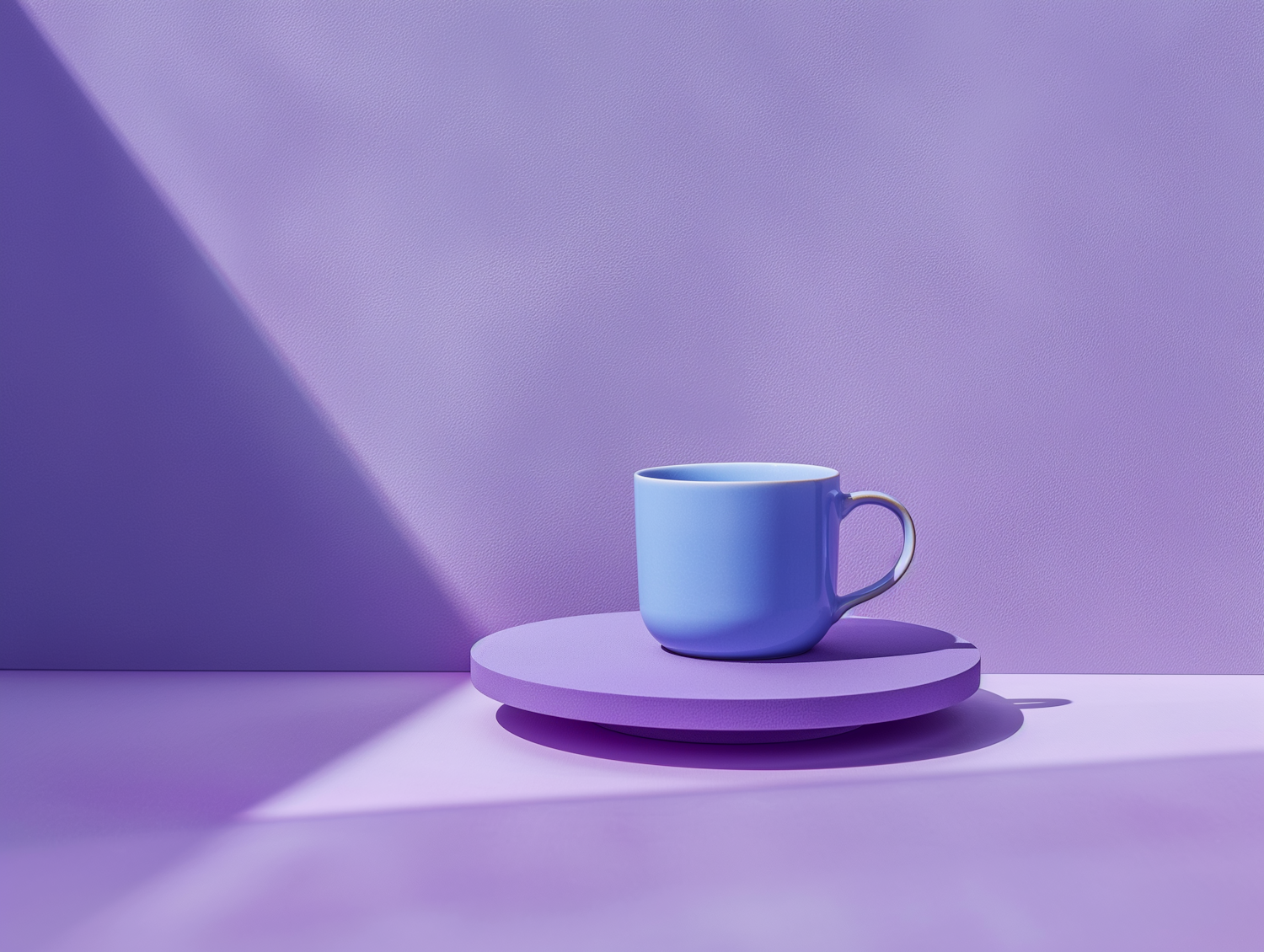 Blue ceramic mug on a purple platform with a soft lavender background, creating a calming and harmonious color scheme.