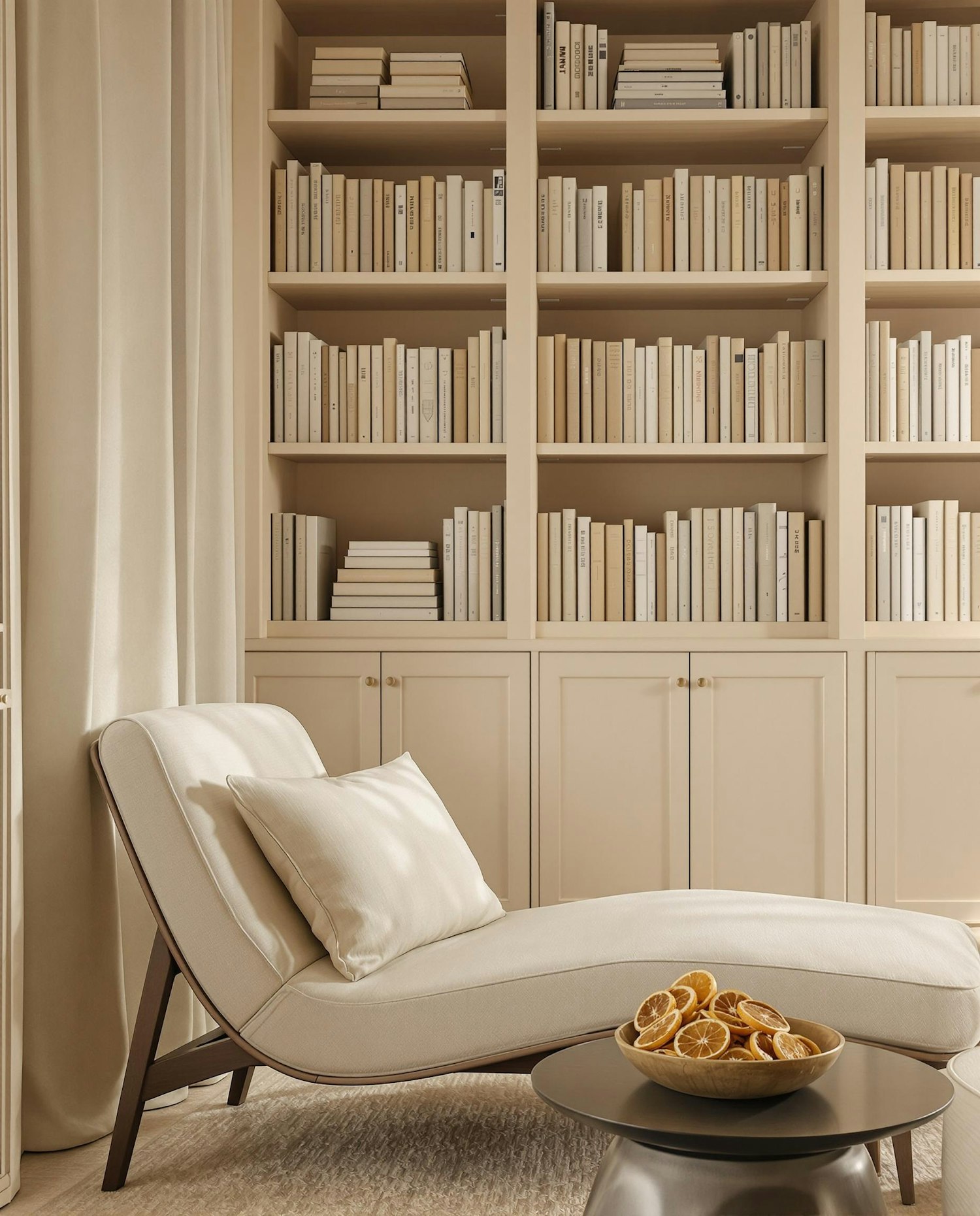 Minimalist reading nook with a cream chaise lounge, beige bookshelf, and a coffee table with dried orange slices for a cozy vibe.