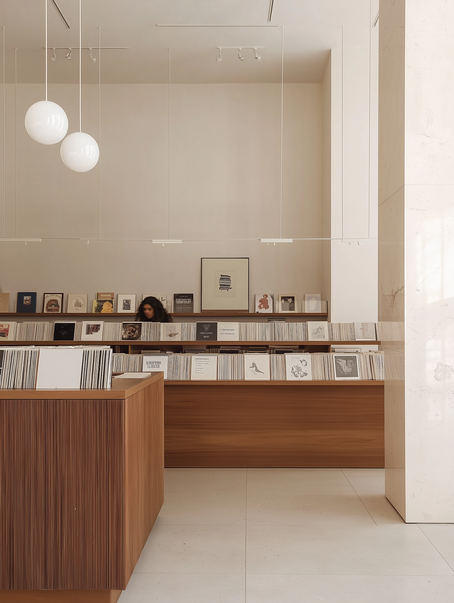 Minimalist record store with wooden shelves, pendant lights, and neatly arranged vinyl records in a warm, neutral-toned interior.