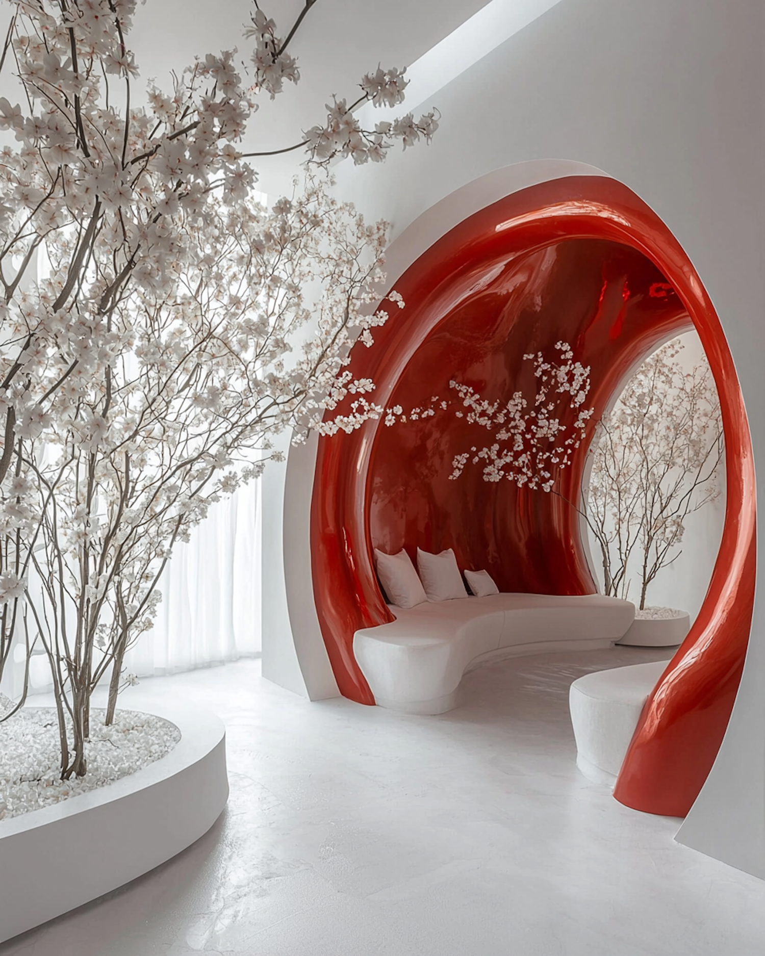 Minimalist interior with a bold red alcove, white seating, and cherry blossoms in planters. A serene blend of modern design and nature.