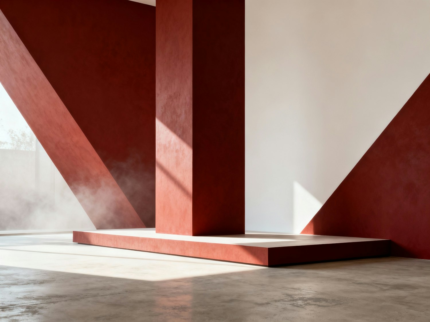 A hyper-realistic editorial hero setup, no products. Space filled with sharp architectural geometry—angled walls in matte auburn red and off-white intersecting dramatically. Floor in soft neutral concrete. Two stages—a tall rectangular pillar and a thin horizontal slab—create a minimal cross composition occupying 80 percent of frame. Side daylight from 45° left defines forms; subtle haze adds diffusion. Camera 70 mm, f/5.6, aspect 16:9. The mood: modern luxury with emotional color—deep auburn warmth meeting pale light, polished yet calm.