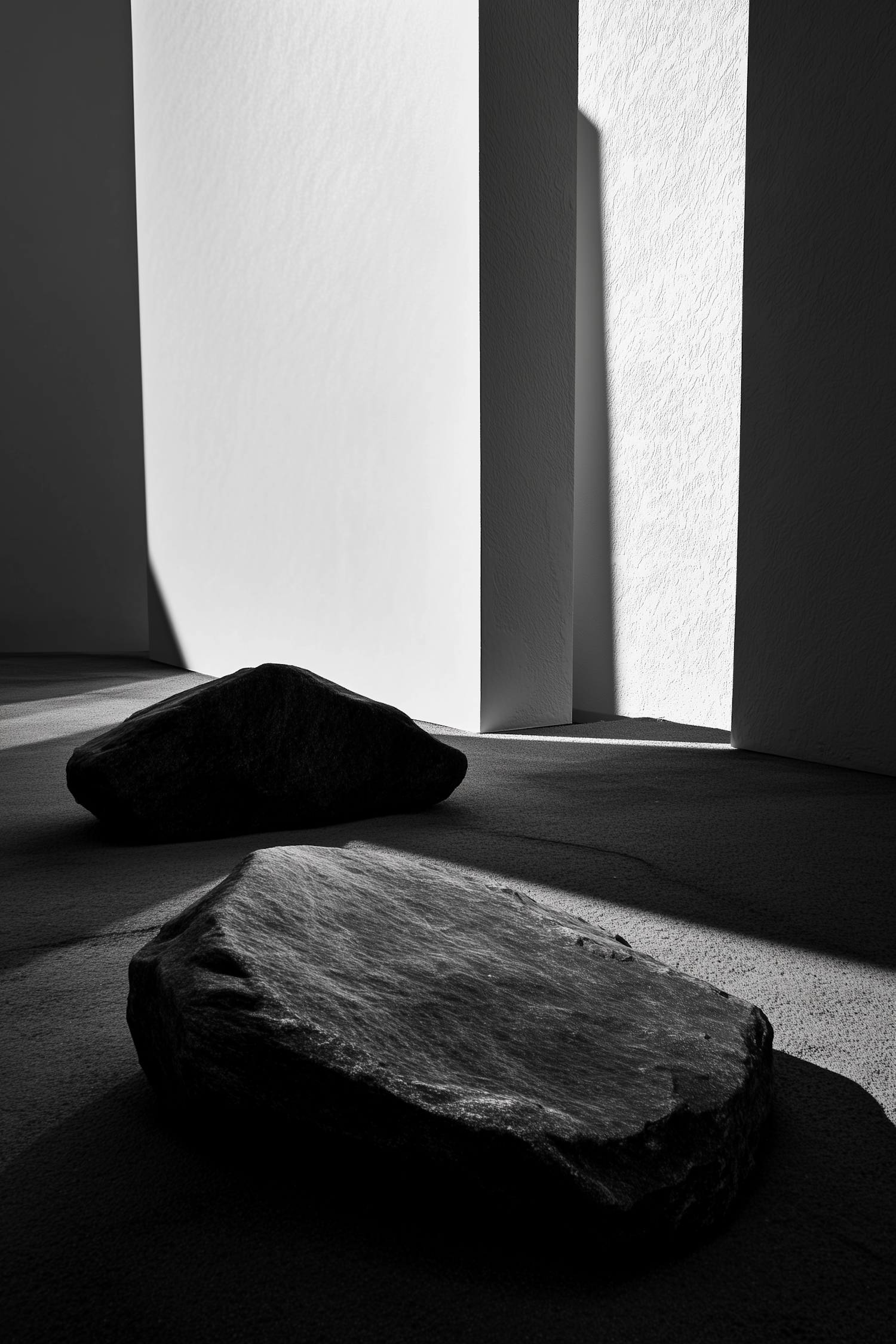 Minimalist scene with dark rocks casting shadows on a textured surface, contrasted by a stark white wall and angular shadows.