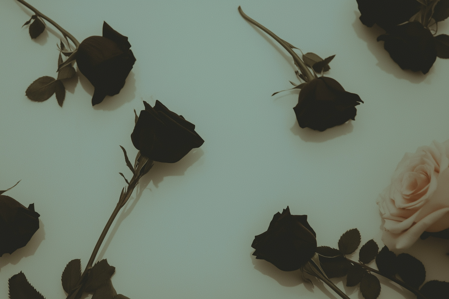 Moody floral arrangement with black roses and a single pale pink rose on a soft green background. Perfect for artistic or gothic themes.