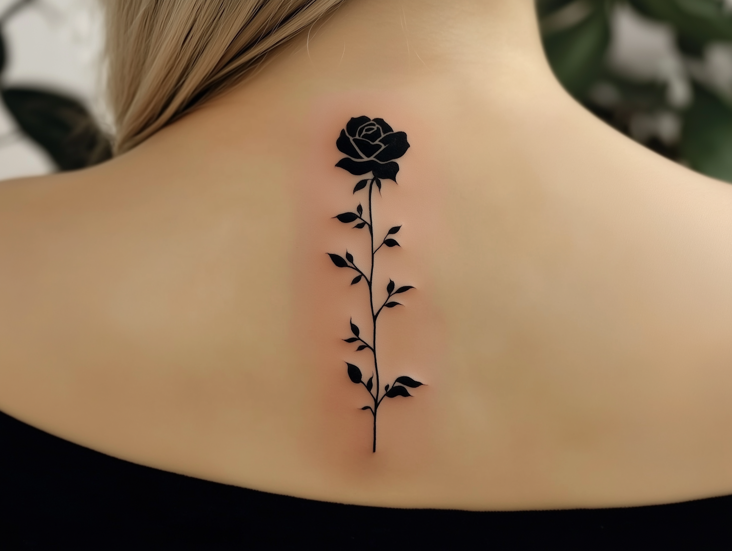 Minimalist black rose tattoo on upper back, featuring a delicate stem and leaves. Perfectly aligned with the spine for an elegant look.