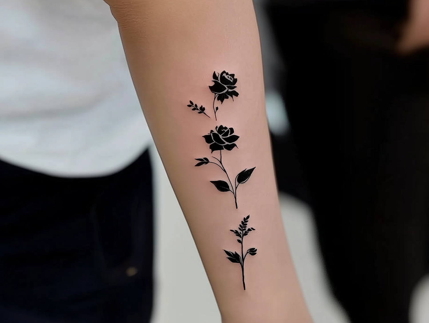 Minimalist black ink rose tattoo on a forearm, featuring two roses with delicate stems and leaves in a clean, elegant design.