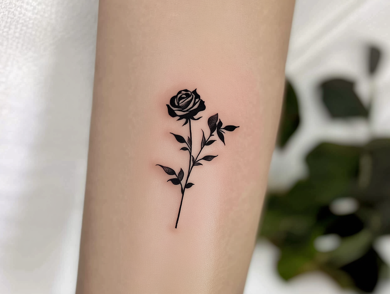 Minimalist black ink rose tattoo on a forearm, featuring intricate details and a fresh, clean design. Perfect for floral tattoo lovers.