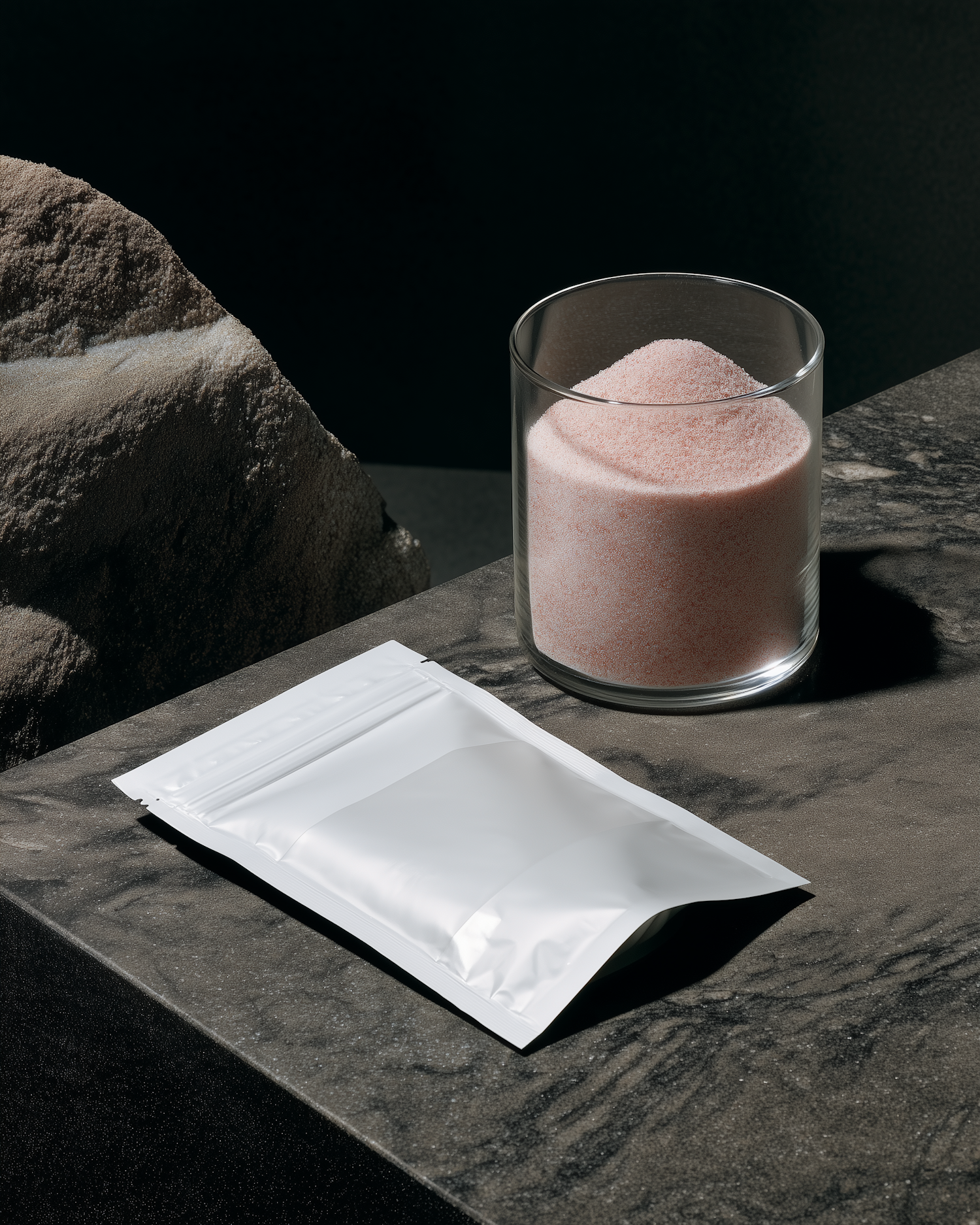A glass of pink powder and a white pouch on a dark textured surface, with a natural stone backdrop and soft directional lighting.