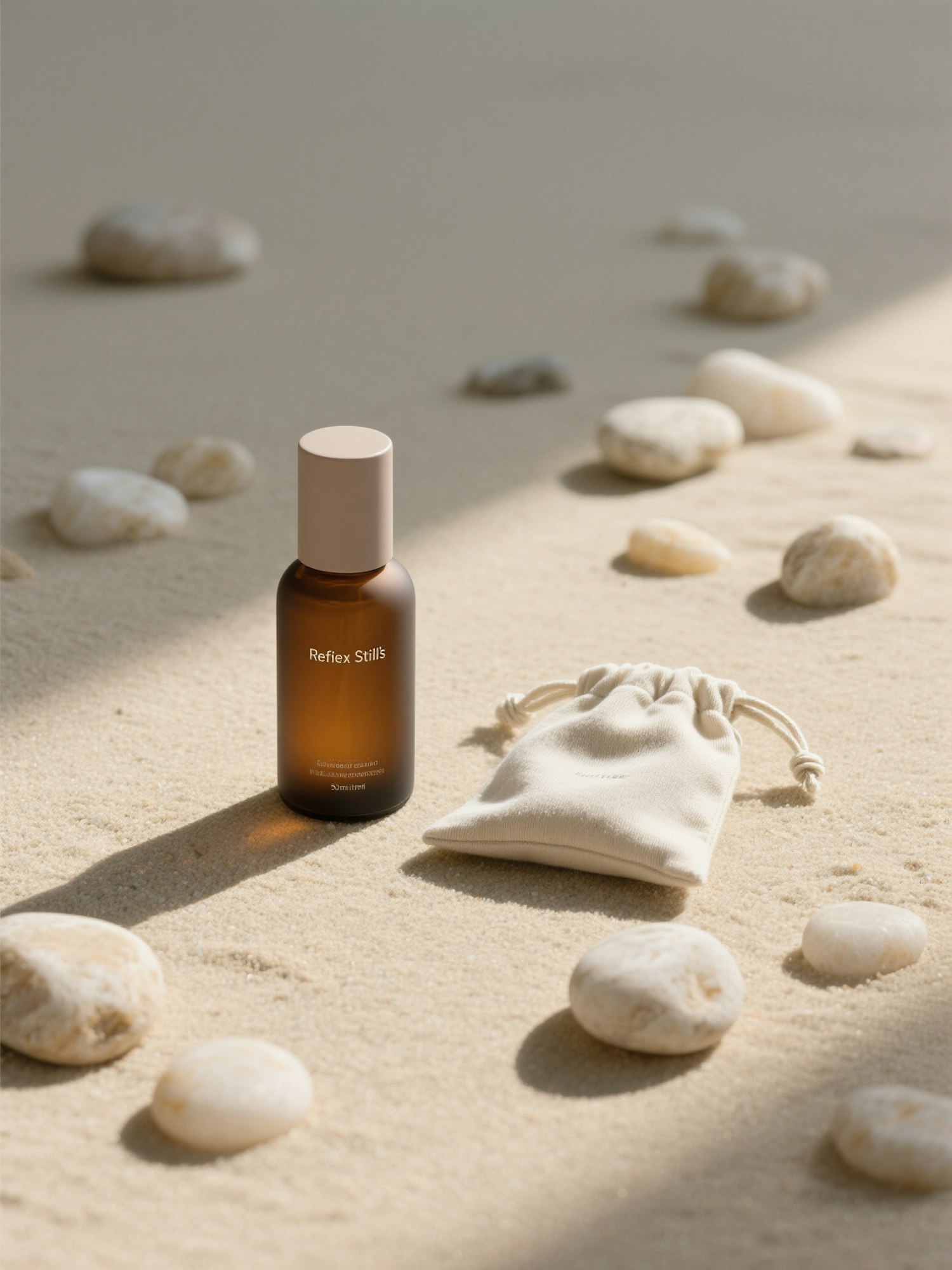 Minimalist product shot of a brown glass bottle and pouch on sand, surrounded by smooth stones, with soft natural lighting.