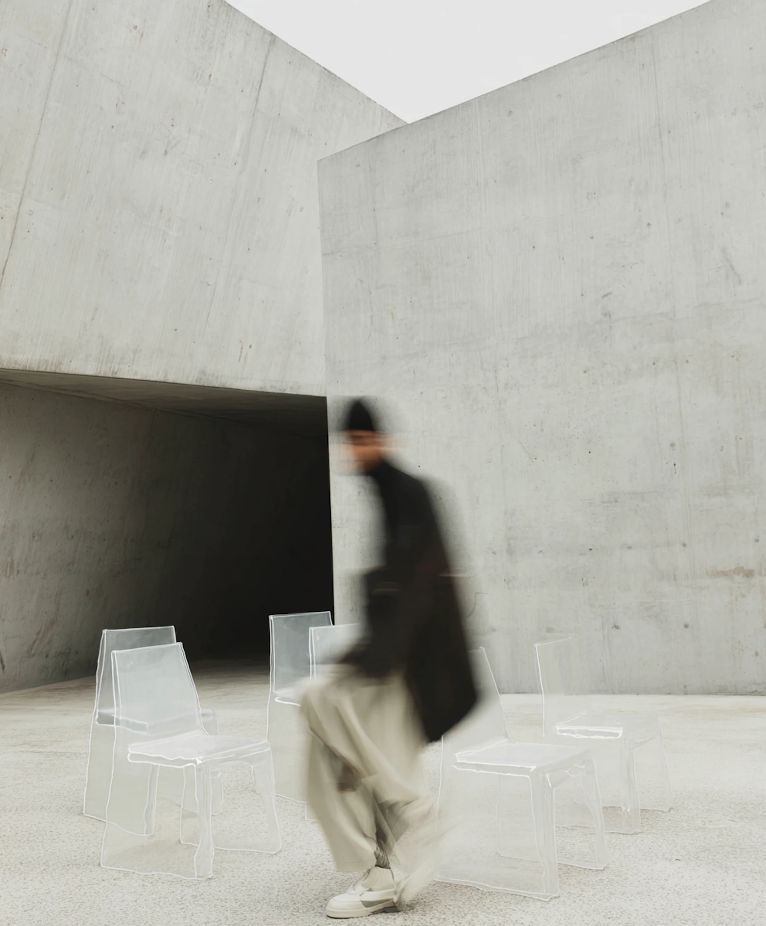 A blurred figure walks among transparent chairs in a minimalist concrete setting, creating a dynamic and modern aesthetic.