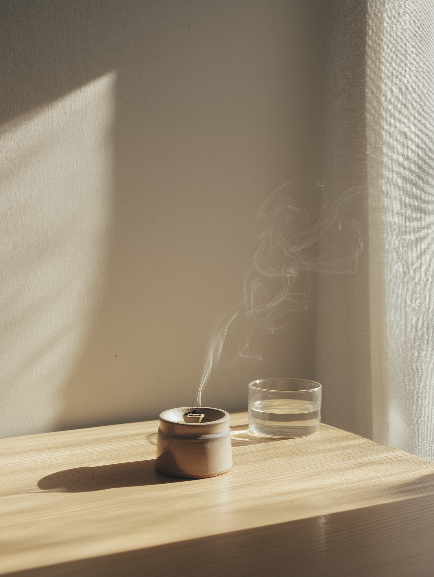 Minimalist setup with an incense holder emitting smoke, a glass of water, and soft sunlight on a wooden surface.