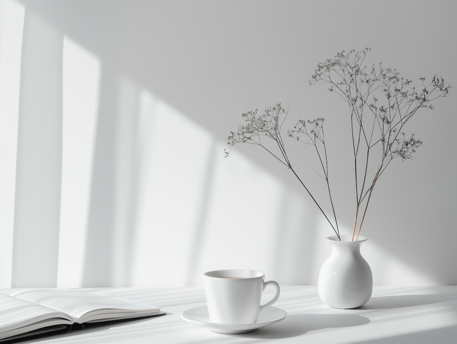 Minimalist scene with a white cup, vase with dried flowers, and an open book on a sunlit table. Tranquil and elegant.