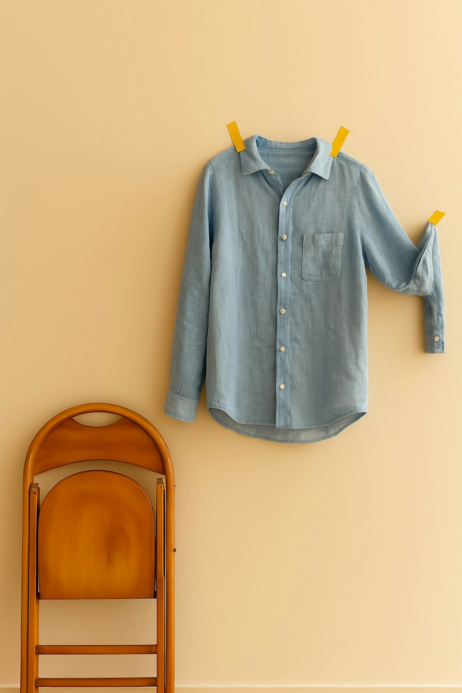 Minimalist setup with a light blue shirt taped to a beige wall and a wooden folding chair below, creating a warm and simple aesthetic.