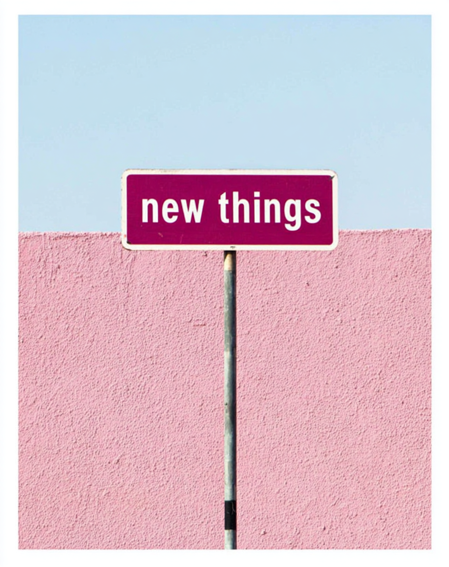 A magenta sign reading 'new things' stands against a pastel pink wall and clear blue sky, creating a vibrant and minimalist aesthetic.