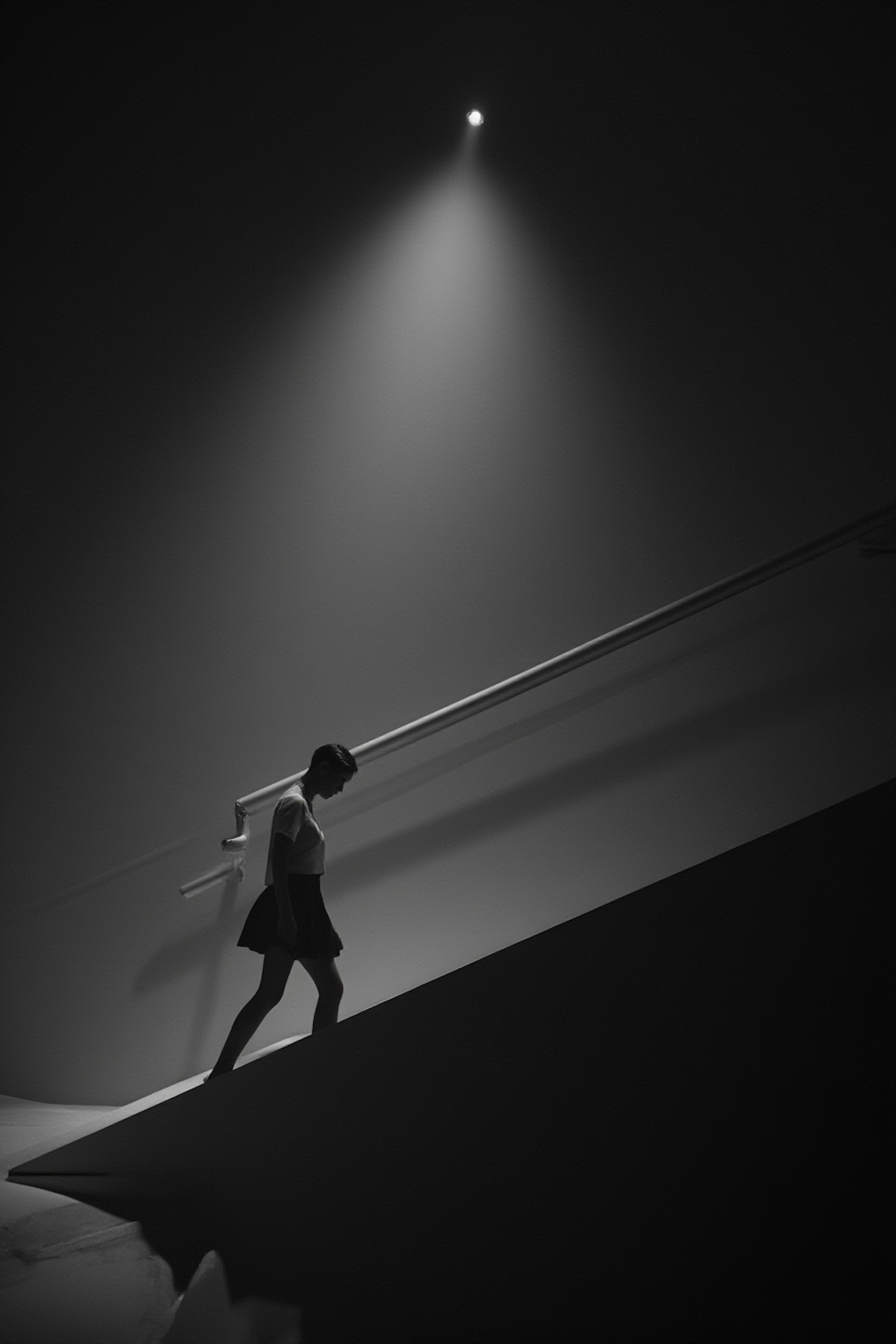 Moody black-and-white shot of a woman walking down a steep incline under a dramatic spotlight, creating sharp contrasts and shadows.