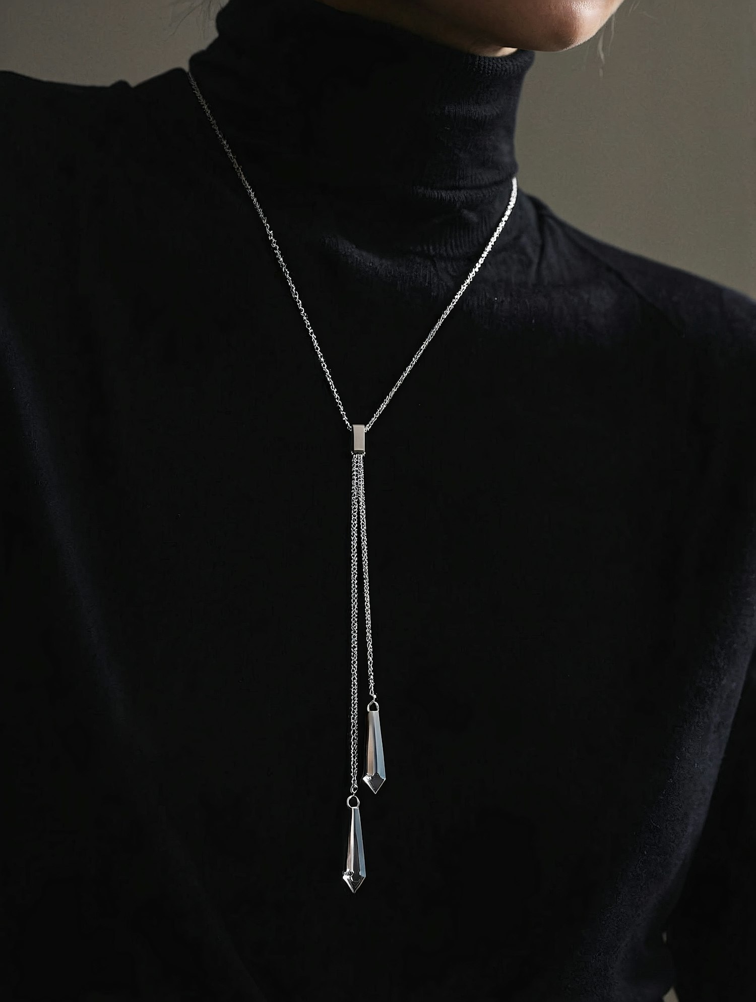 Minimalist silver Y-shaped necklace with crystal pendants, elegantly paired with a black turtleneck for a chic and modern look.