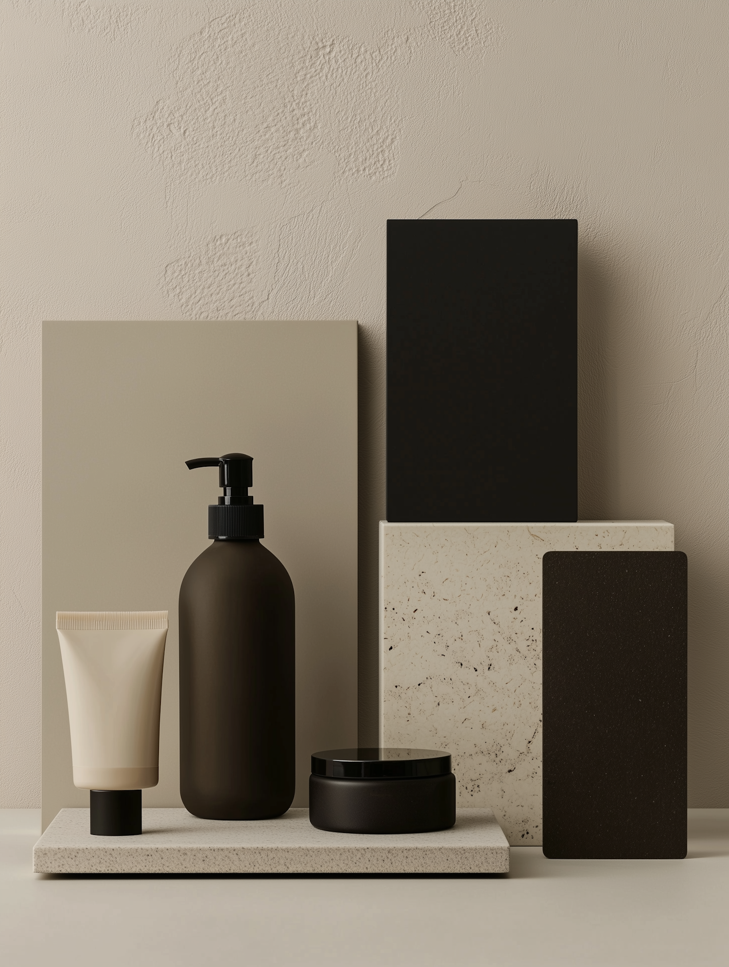 Minimalist skincare product display with black and beige bottles on a textured beige background.