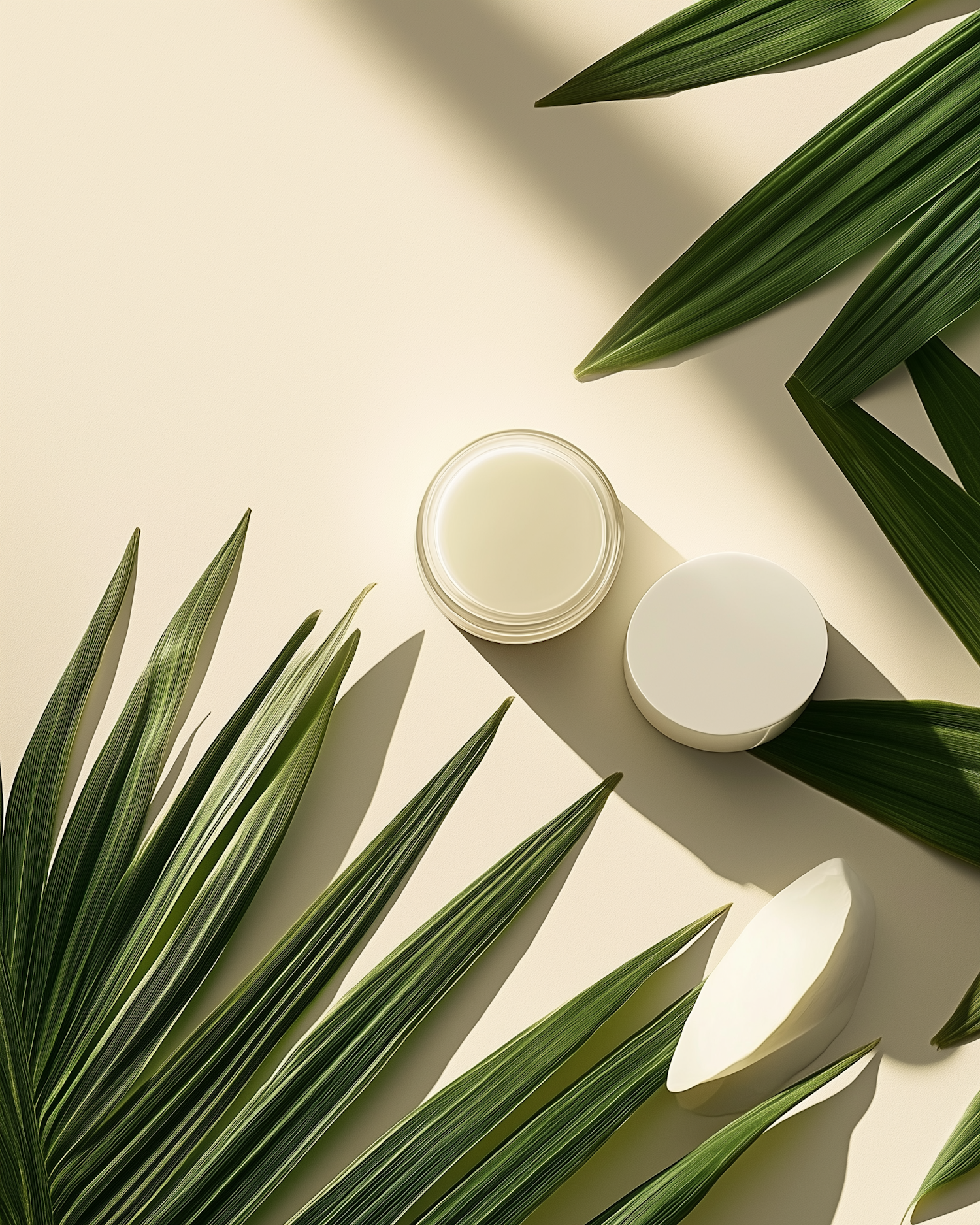 Minimalist skincare scene with a cream jar and lush green palm leaves on a beige background.