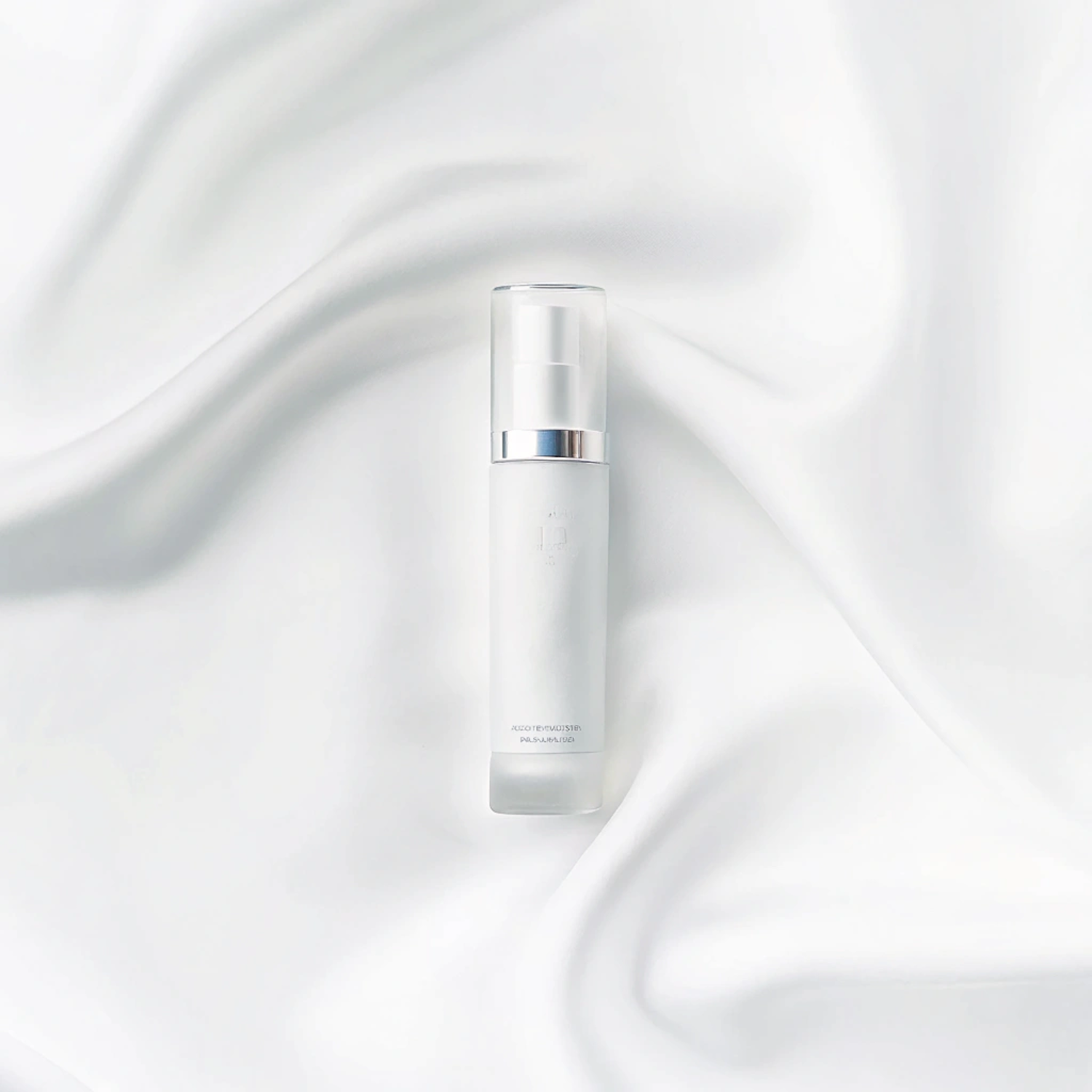 Minimalist white skincare bottle on soft, flowing white fabric, featuring a frosted finish and silver accents for a luxurious look.
