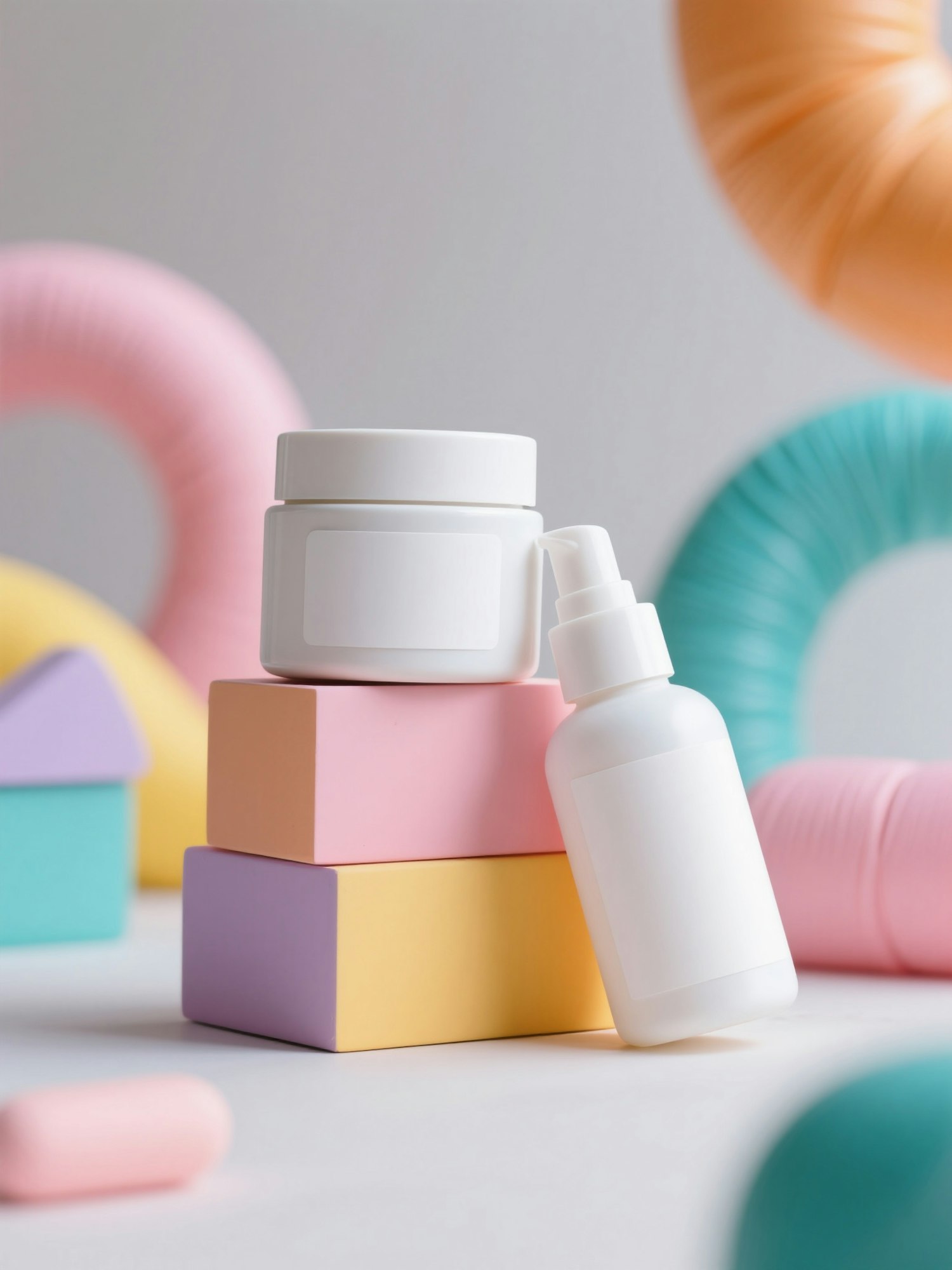 Minimalist skincare packaging on pastel blocks with abstract shapes in the background, creating a clean and modern aesthetic.