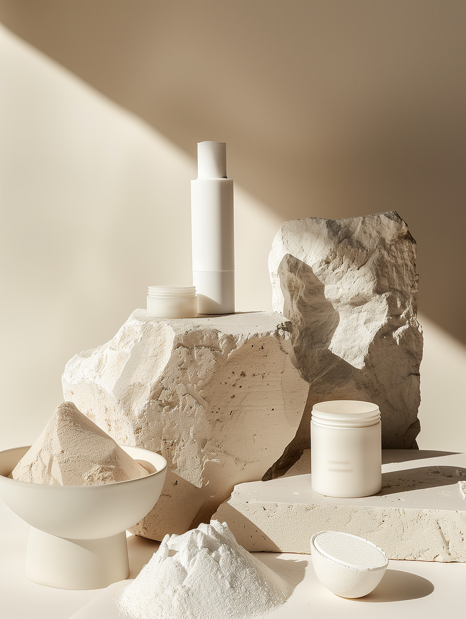 Minimalist arrangement of skincare containers amid natural stones and powders, highlighted by soft neutral hues and natural lighting.