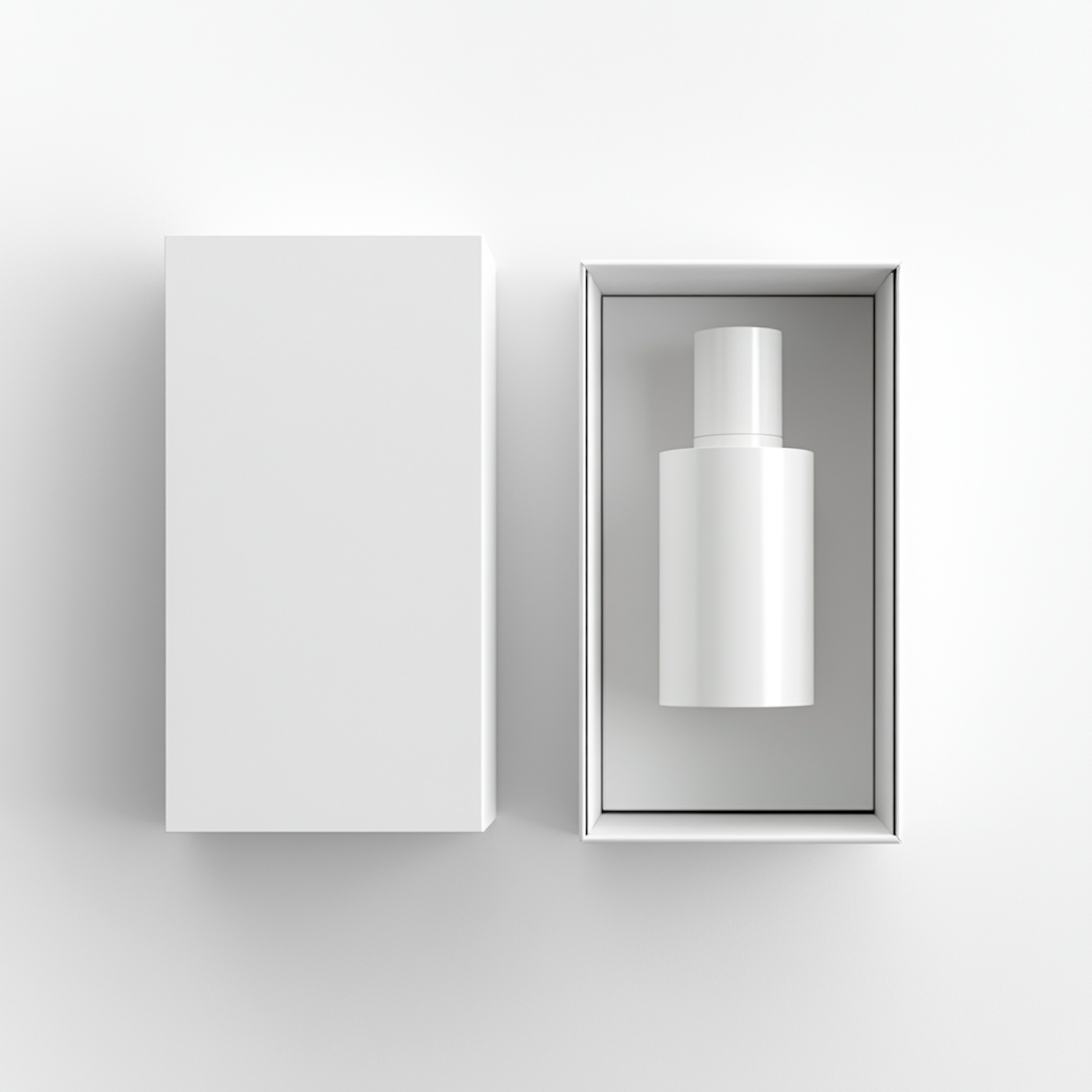 Minimalist white box with a sleek cylindrical bottle inside, perfect for cosmetics or skincare, on a clean white background.