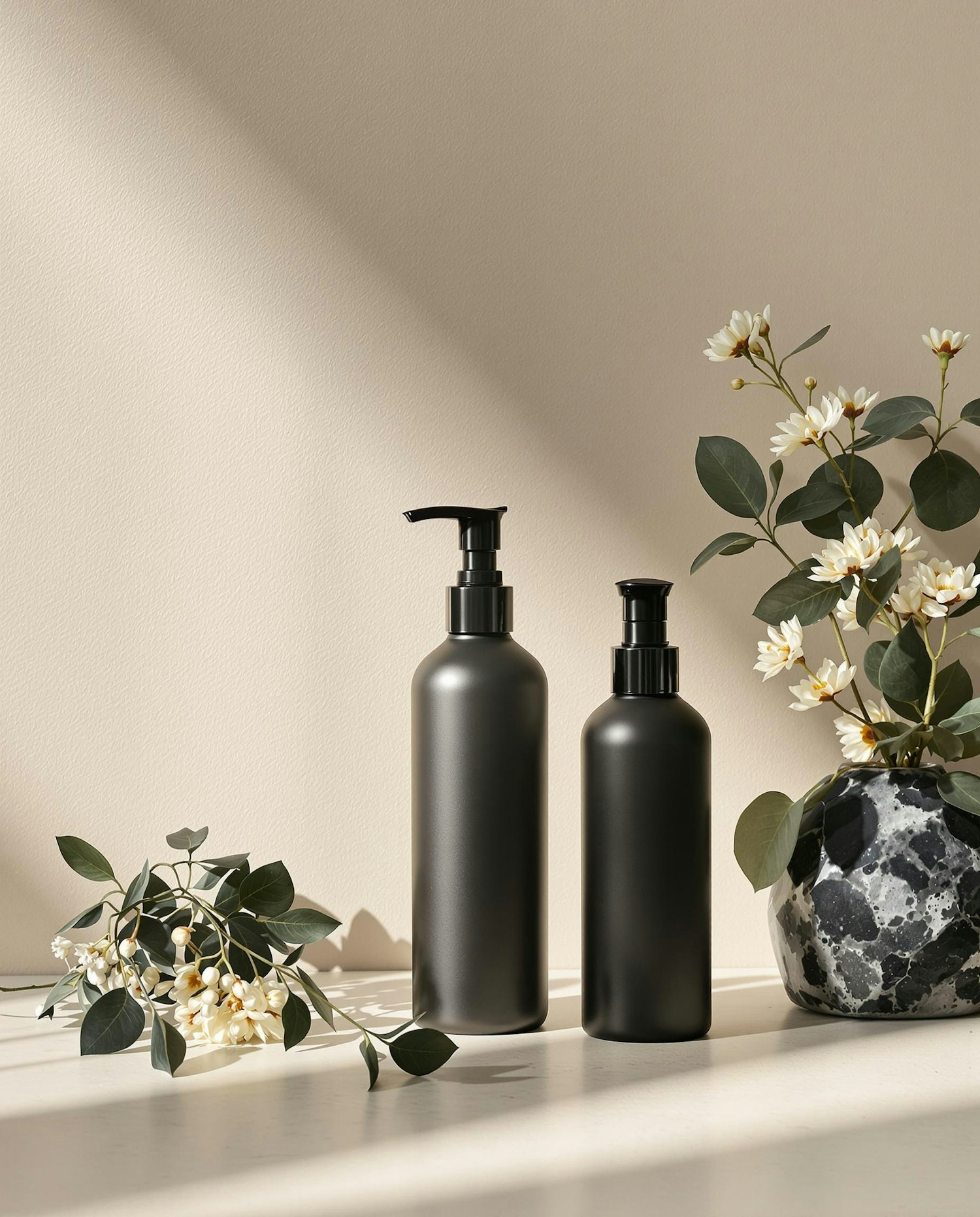 A tightly framed luxury skincare composition captured in soft, cool daylight with subtle warm undertones. Two matte black or dark smoky glass pump bottles with glossy black dispensers stand close together on a pale stone or textured plaster surface. The bottles are entirely blank — no labels, no markings — enhancing a minimalist, premium look. The frame is cropped to focus on the objects, with minimal empty space. On the right side, dark eucalyptus leaves and muted green foliage are styled with a small cluster of crisp white flowers, adding both natural softness and visual contrast. A soft diagonal shadow falls across the muted grey-beige wall in the background, cast by the natural light from the left. To enrich the composition, a small charcoal-toned stone and a deep ceramic element are placed near the bottles, anchoring the scene. The image feels quiet and refined, with cold neutral tones, controlled shadows, and a dense but airy atmosphere — editorial, minimal, and rich in texture.