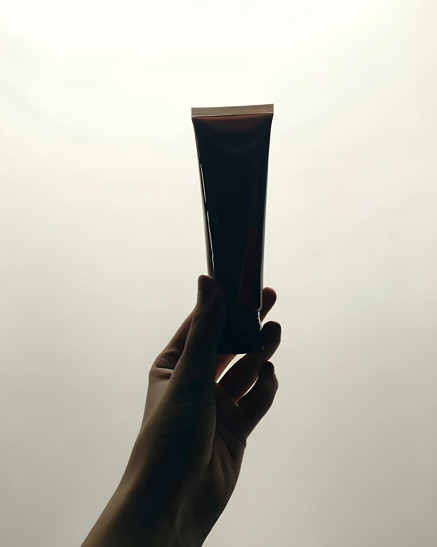 Minimalist silhouette of a hand holding a dark cosmetic tube against a bright background, creating a clean and modern aesthetic.