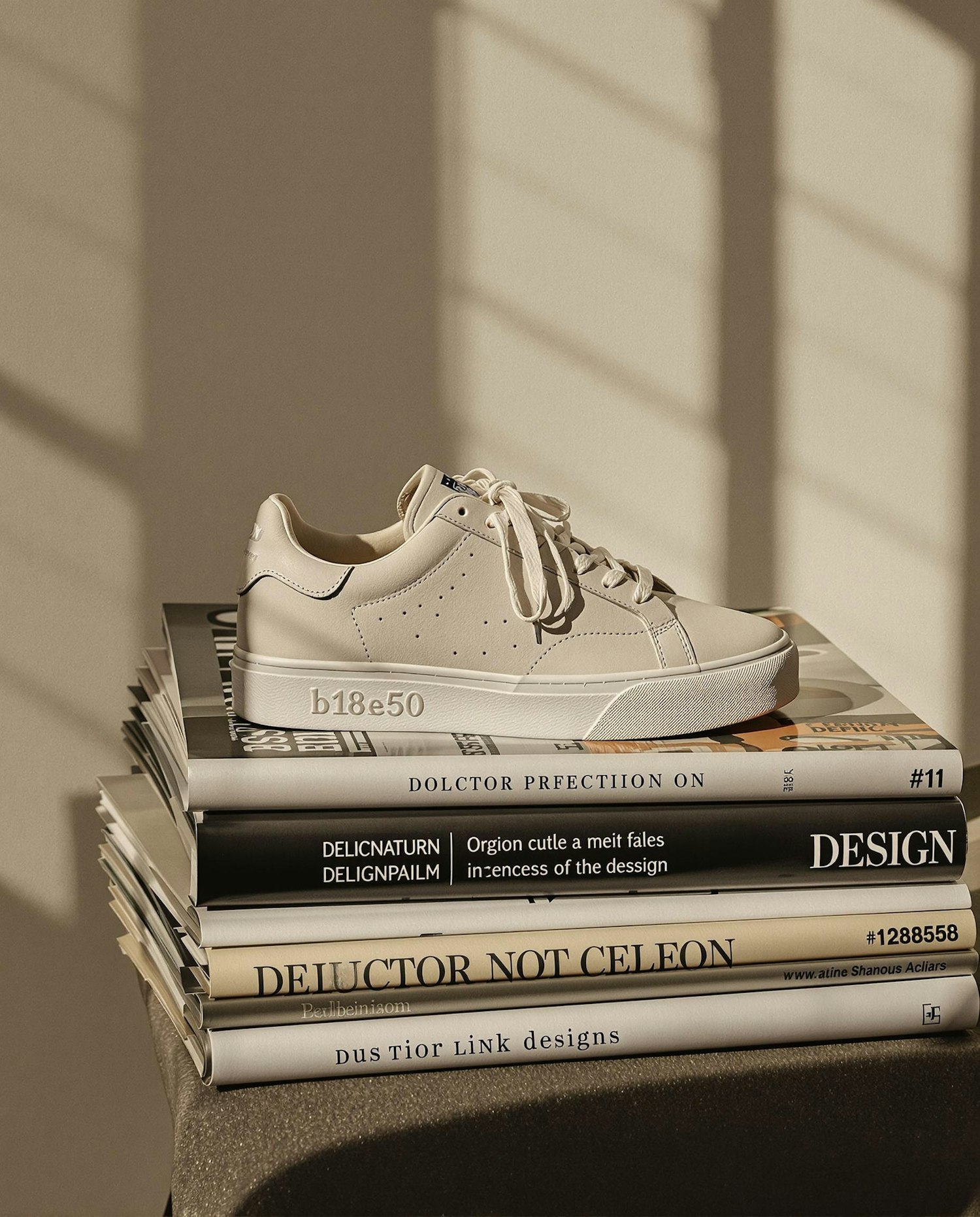 Minimalist beige sneaker on stacked design books, bathed in warm light with shadow patterns. Perfect blend of fashion and creative design.