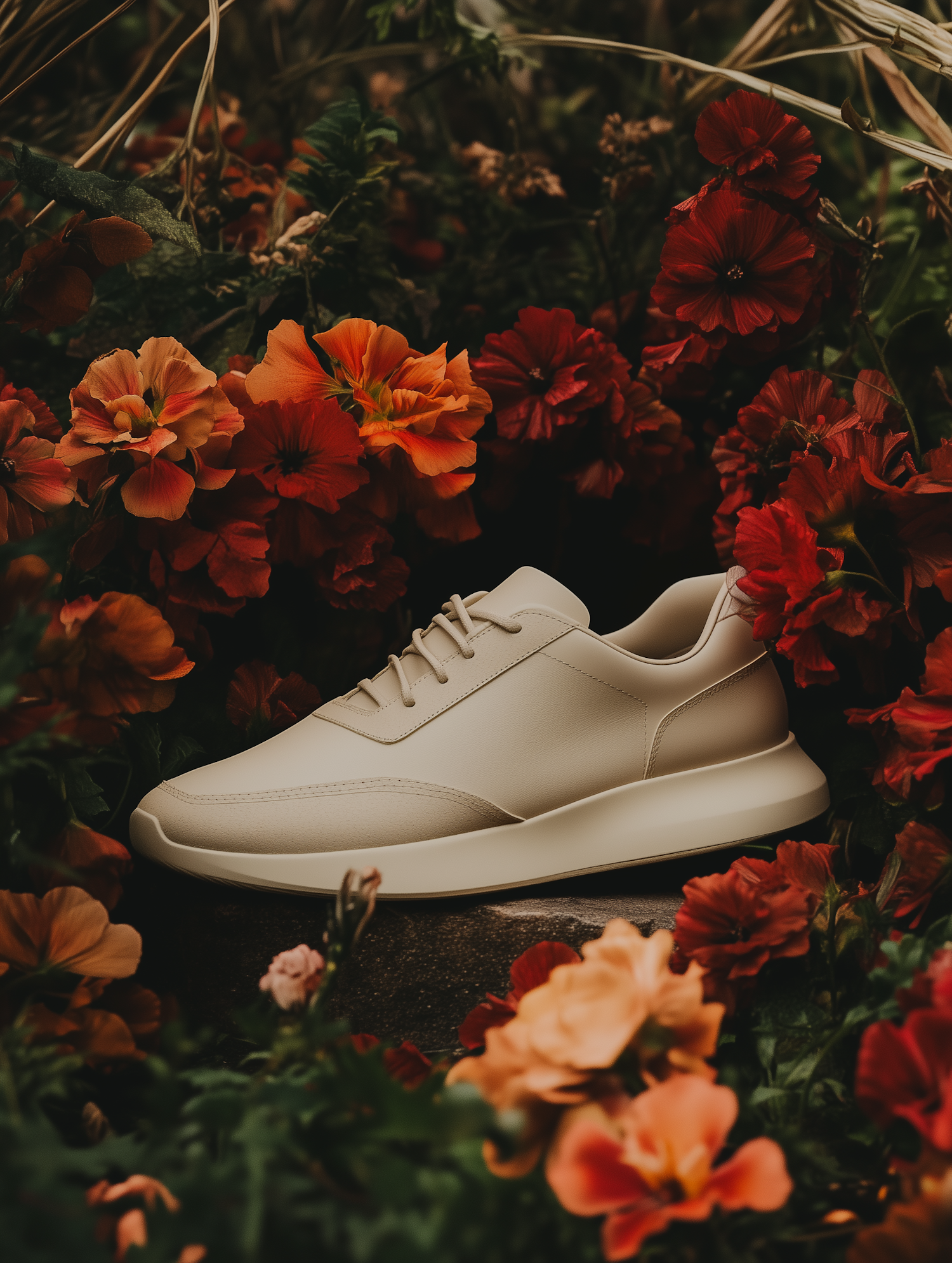 Minimalist beige sneaker surrounded by vibrant red and orange flowers, creating a striking contrast with lush greenery in the background.