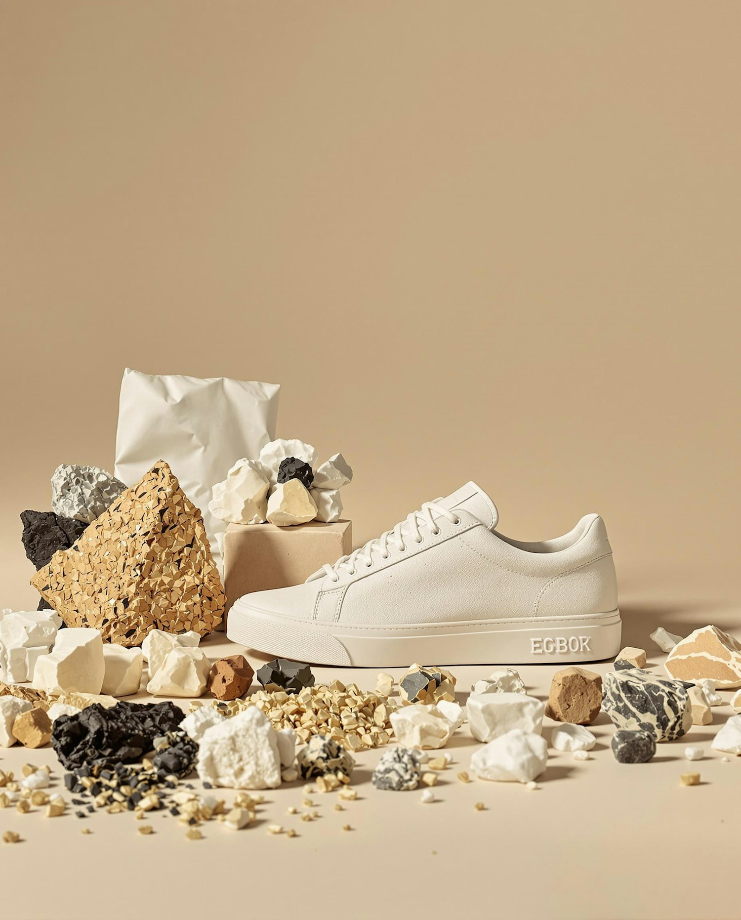 product photography style, soft ambient light, minimal backdrop, high-end editorial feel, beige or muted colored background, focus on texture and material, shallow depth of field, soft shadows, clean studio setting, minimalist sneaker next to recycled material chunks (plastic, rubber, cork), raw textures and clean arrangement, background color #eae2d6