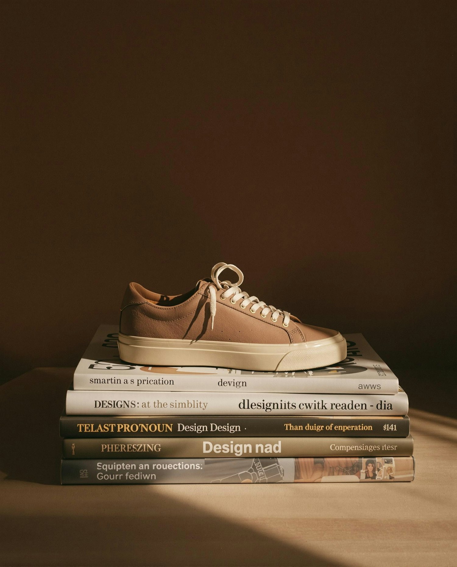 Beige sneaker with white laces on a stack of design books, set against a warm brown background with soft lighting.