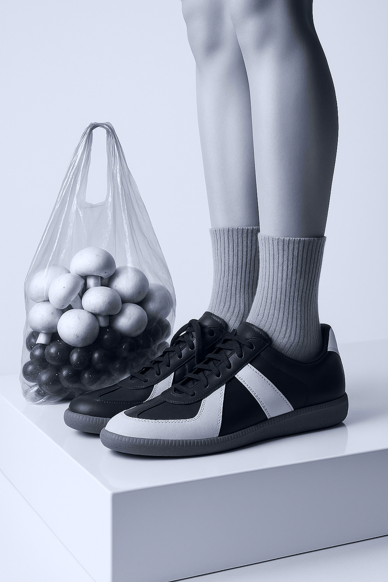 Minimalist black and white sneakers paired with gray socks, styled next to a bag of abstract spheres for a modern, artistic vibe.