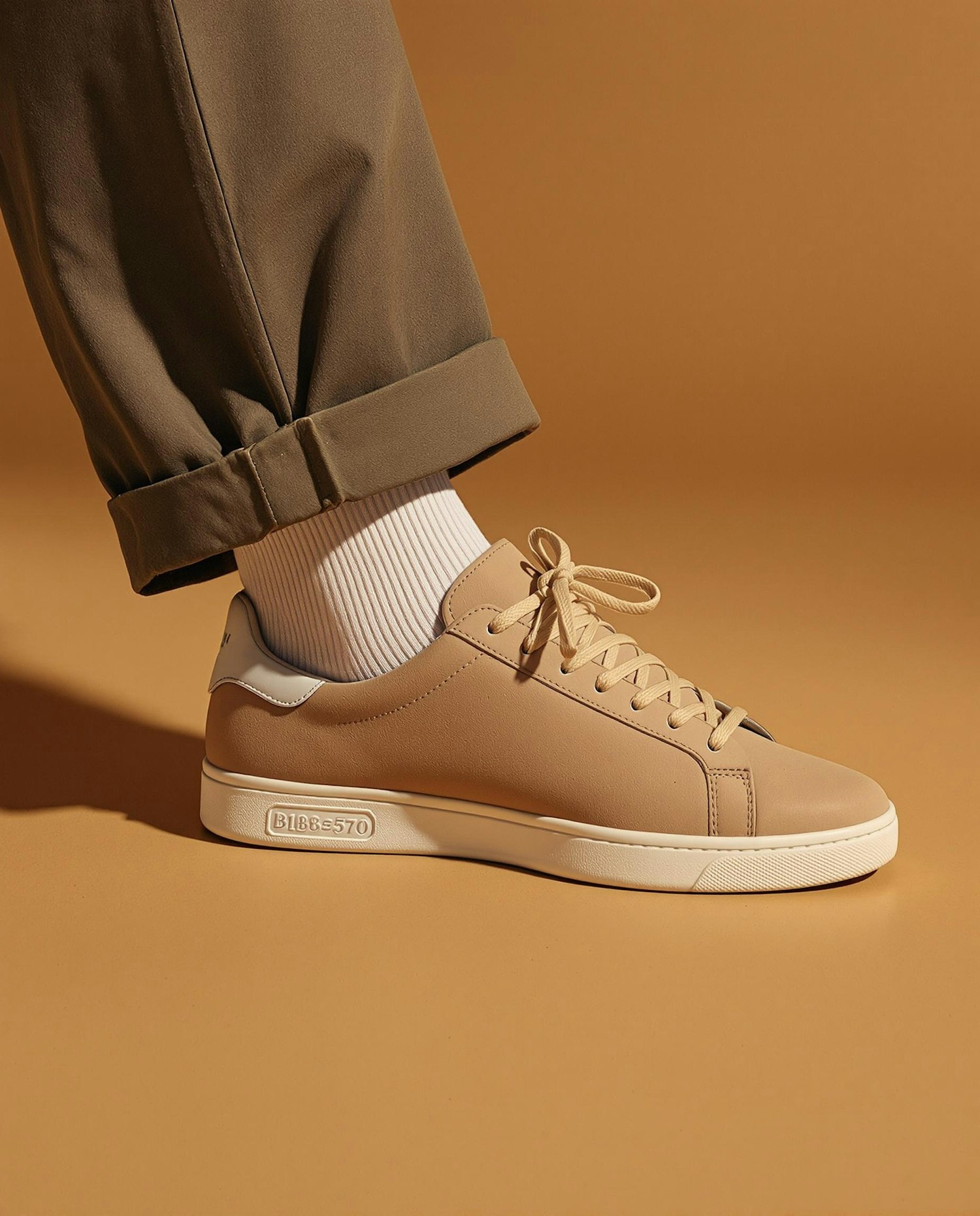 Stylish beige sneakers with white soles paired with olive green pants and white socks, set against a warm beige background.