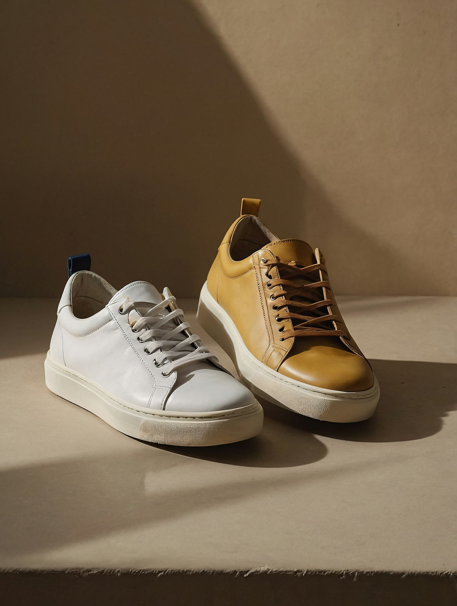 Minimalist white and mustard yellow sneakers with smooth leather finish, thick rubber soles, and soft lighting on a beige background.