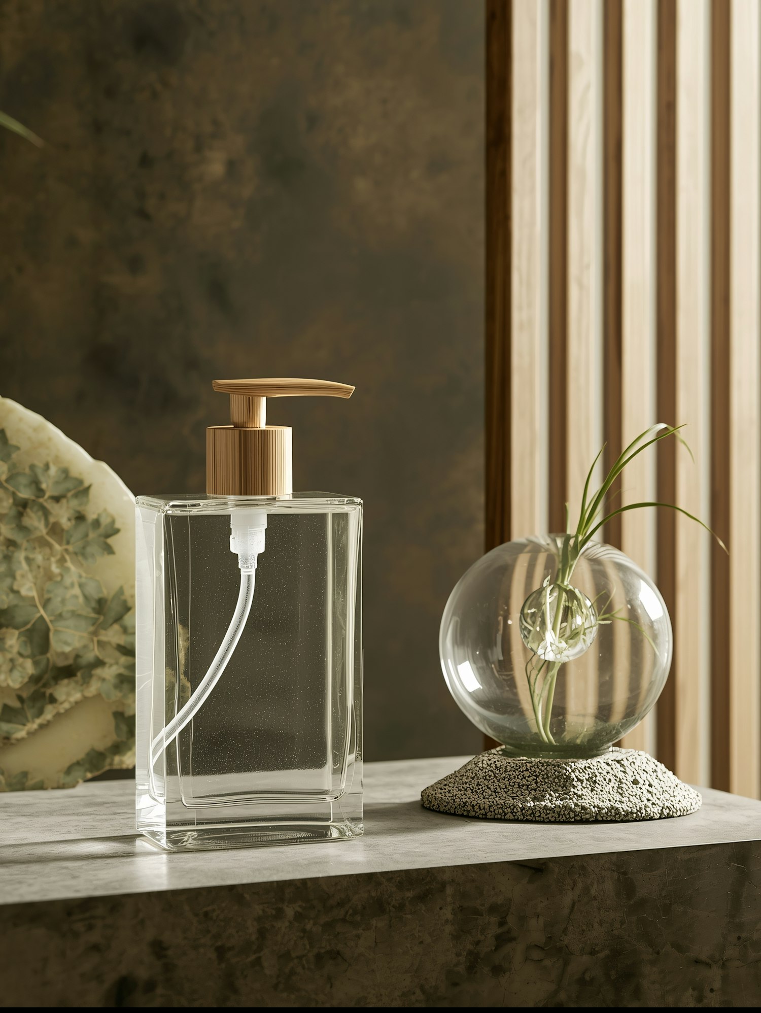 Minimalist decor with a clear soap dispenser and a glass vase holding a plant, set against a natural-toned background.