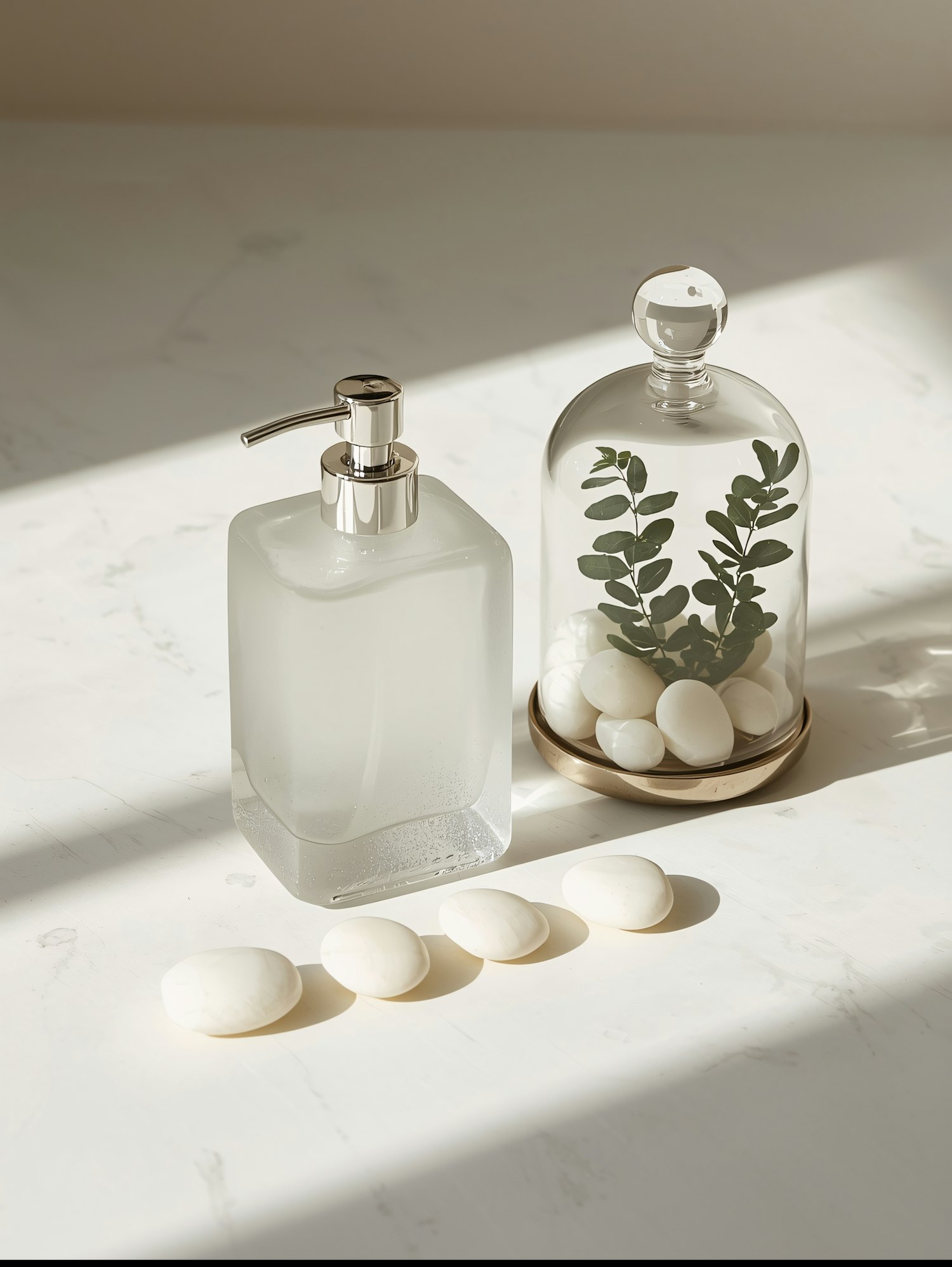 Minimalist decor with a soap dispenser, glass cloche with greenery, and white stones on a marble surface in soft natural light.