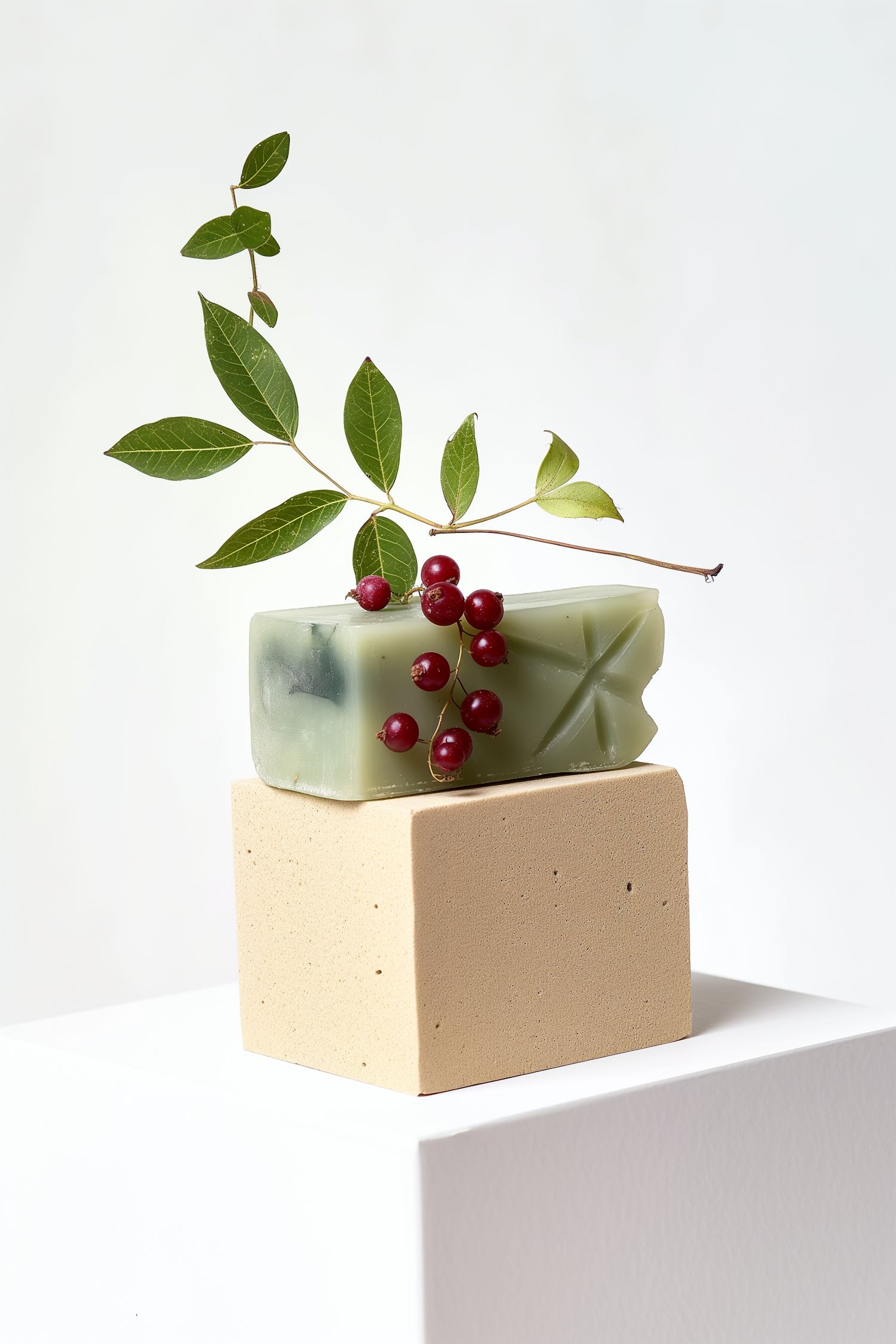 Minimalist setup with green soap, red berries, and leaves on a beige block against a clean white background. Perfect for natural product themes.