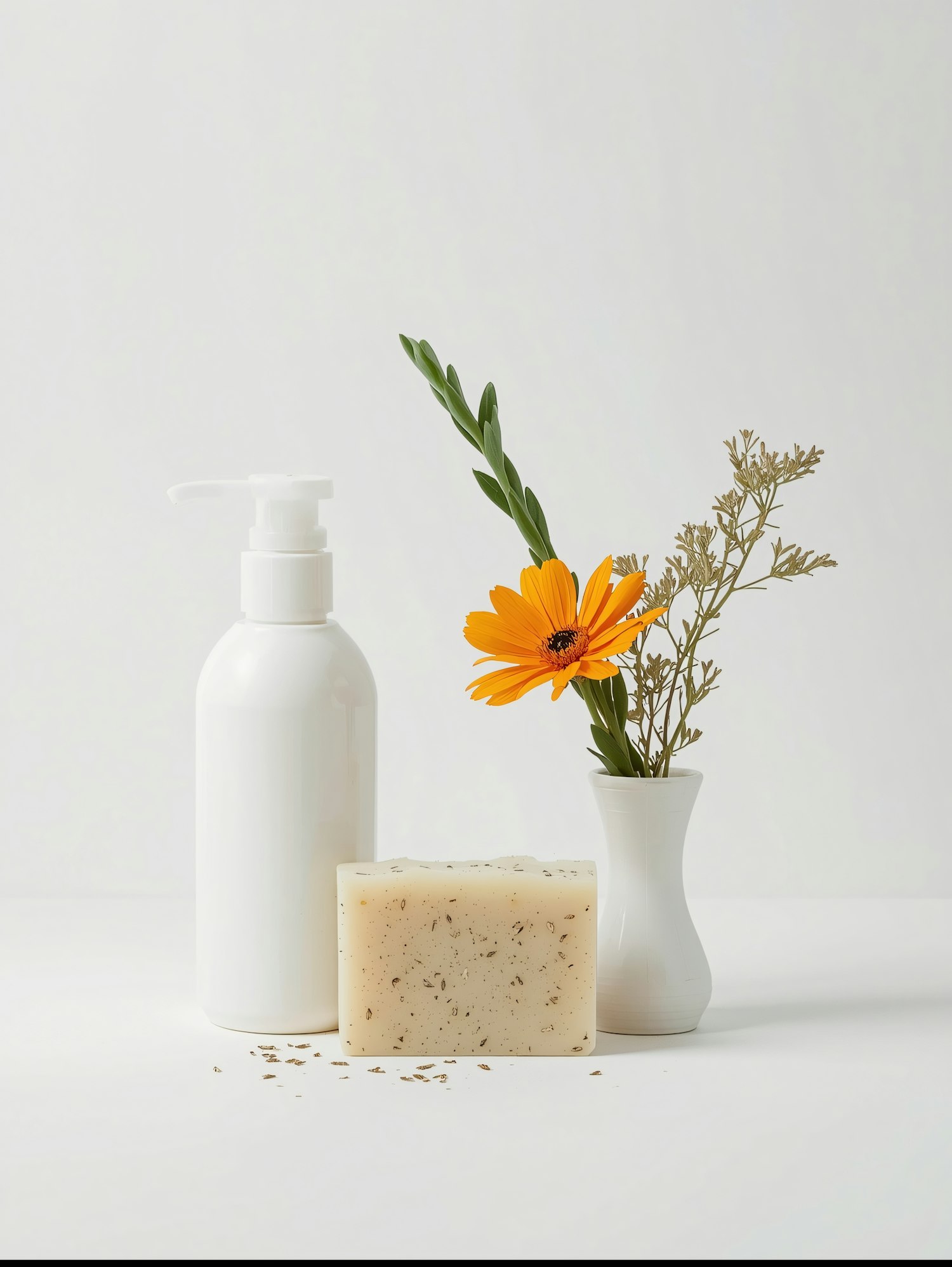 Minimalist setup with a white pump bottle, natural soap, and a vase with an orange flower on a clean white background.