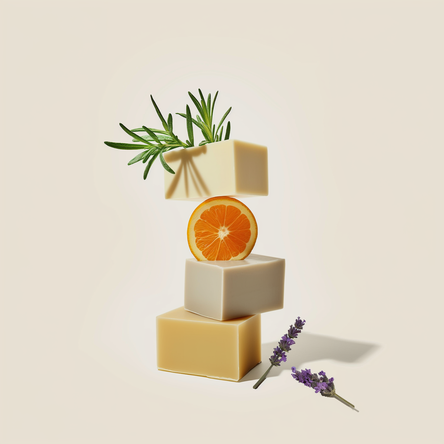 Stacked soap bars with rosemary, orange slice, and lavender on a beige background. Perfect for natural skincare or aromatherapy themes.