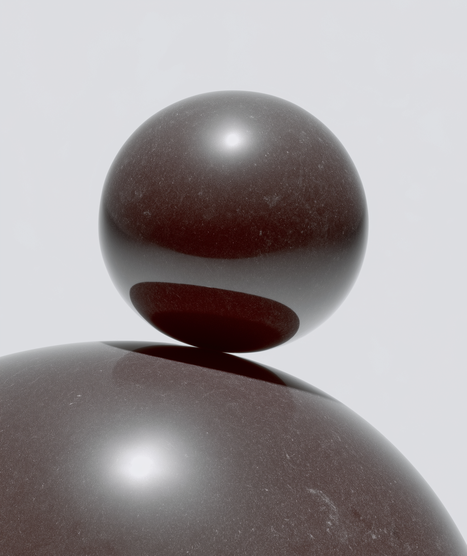 A minimalist arrangement of two glossy, dark brown spheres, one balanced atop the other, against a plain light gray background.
