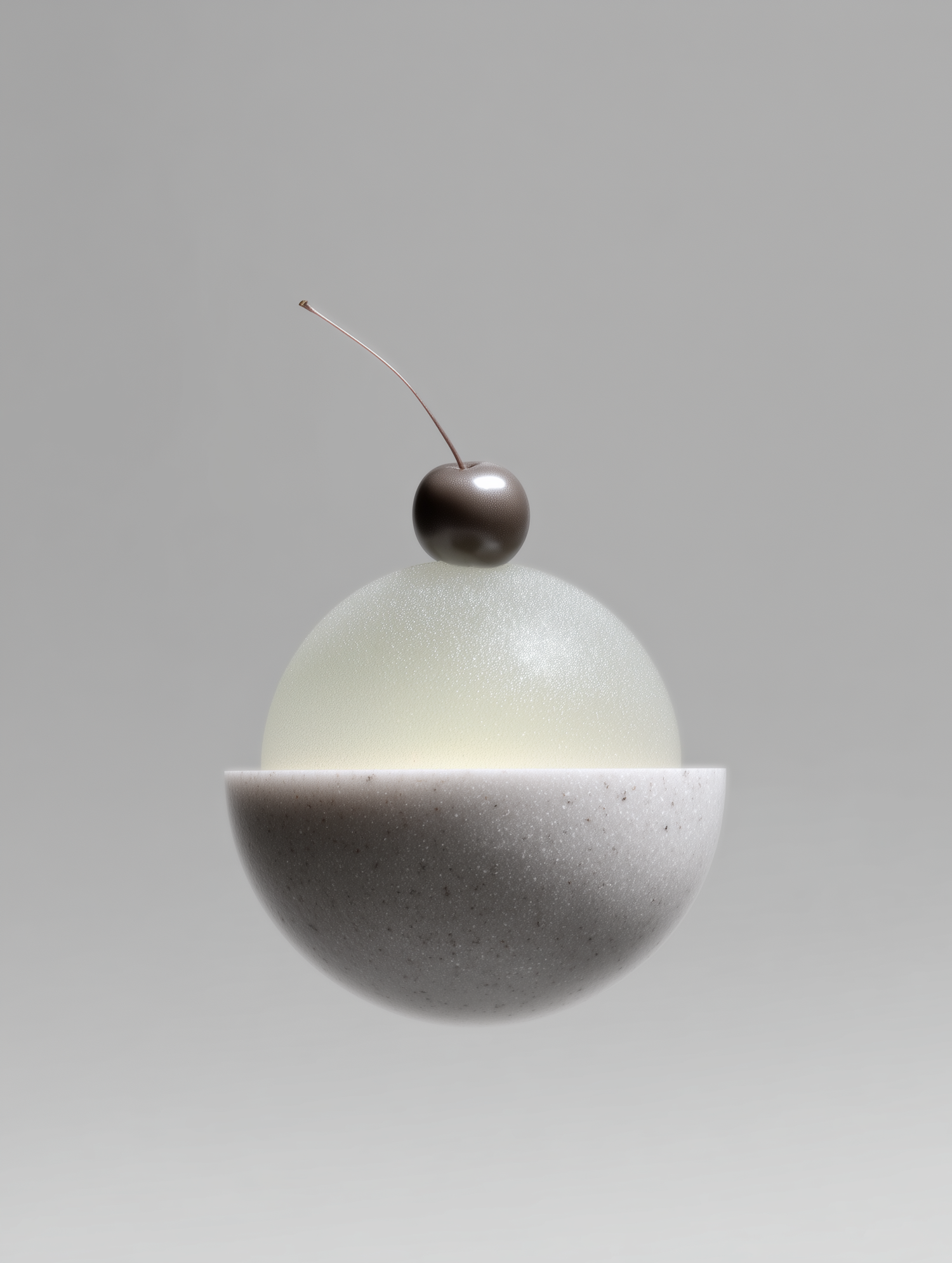 A sleek 3D design featuring a glowing sphere with a metallic cherry on top, set against a neutral gray background.