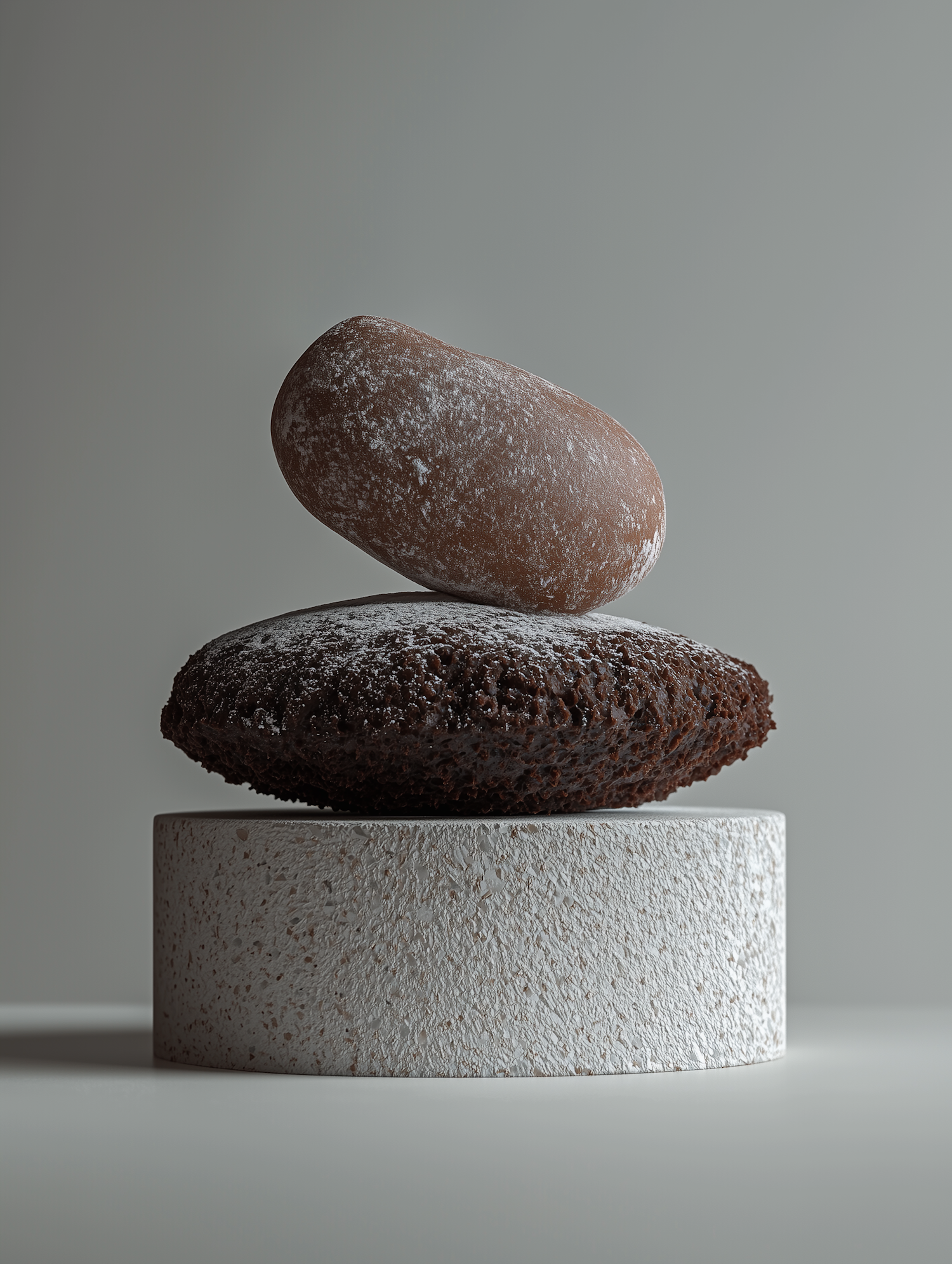 Minimalist stack of textured objects on a gray background, featuring a cylindrical base, dark porous middle, and smooth brown top.