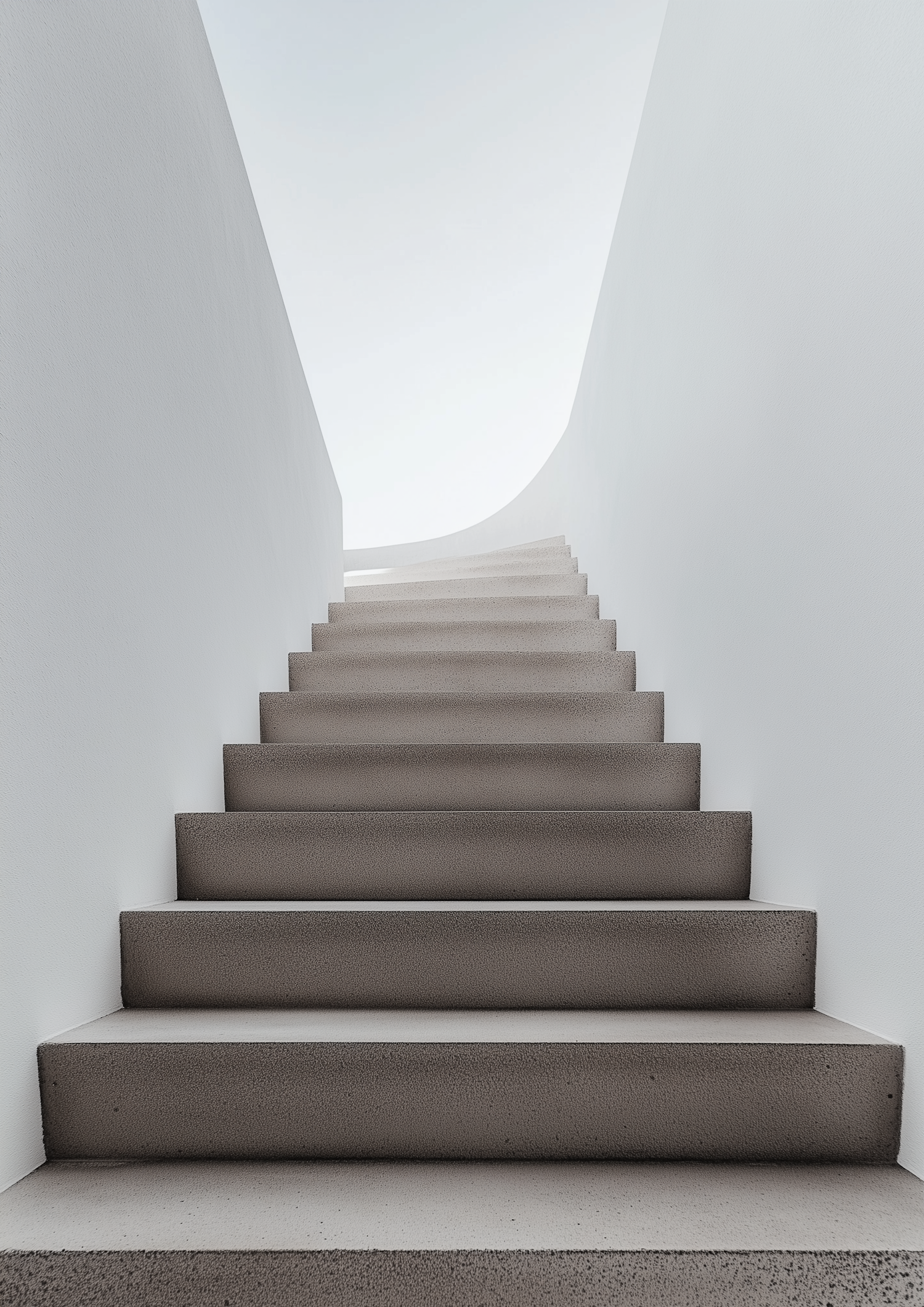 Minimalist staircase with smooth concrete steps and white walls, leading to a bright open space. Modern and serene architectural design.