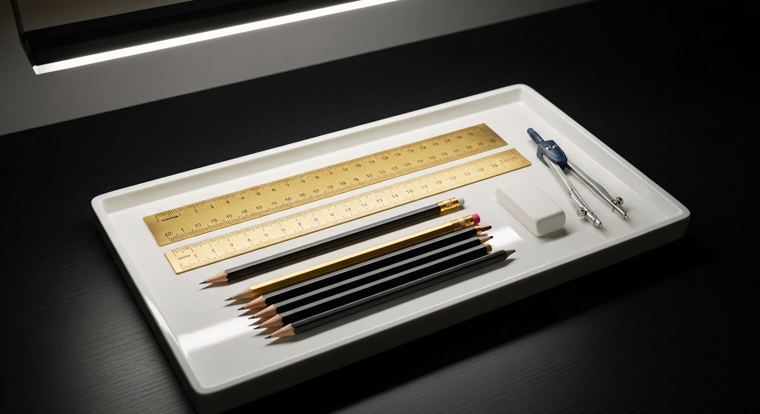 A sleek arrangement of pencils, a golden ruler, a compass, and an eraser on a white tray, perfect for a modern workspace.