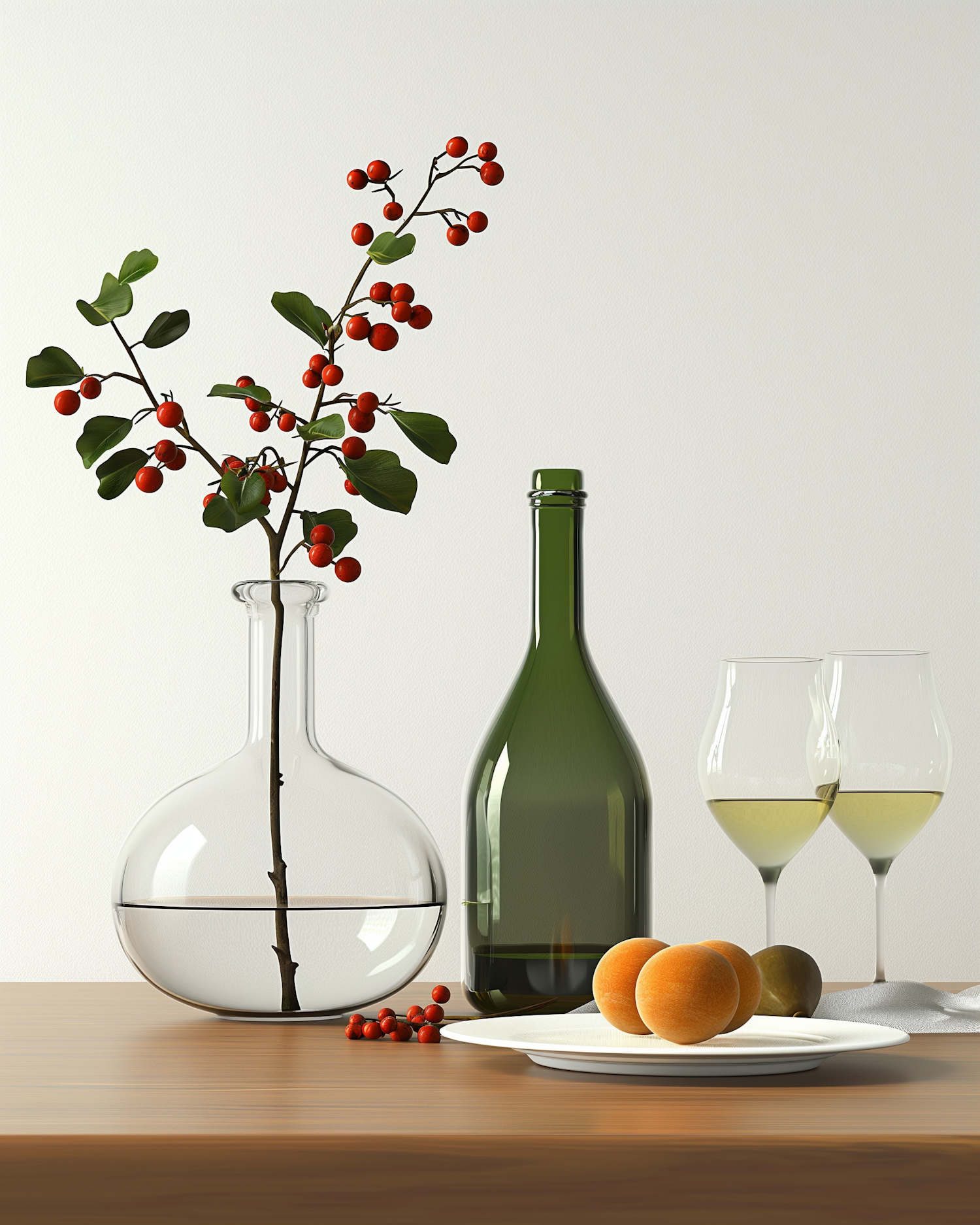 Minimalist still life with a glass vase, red berries, wine bottle, glasses, and a plate of apricots on a wooden table.