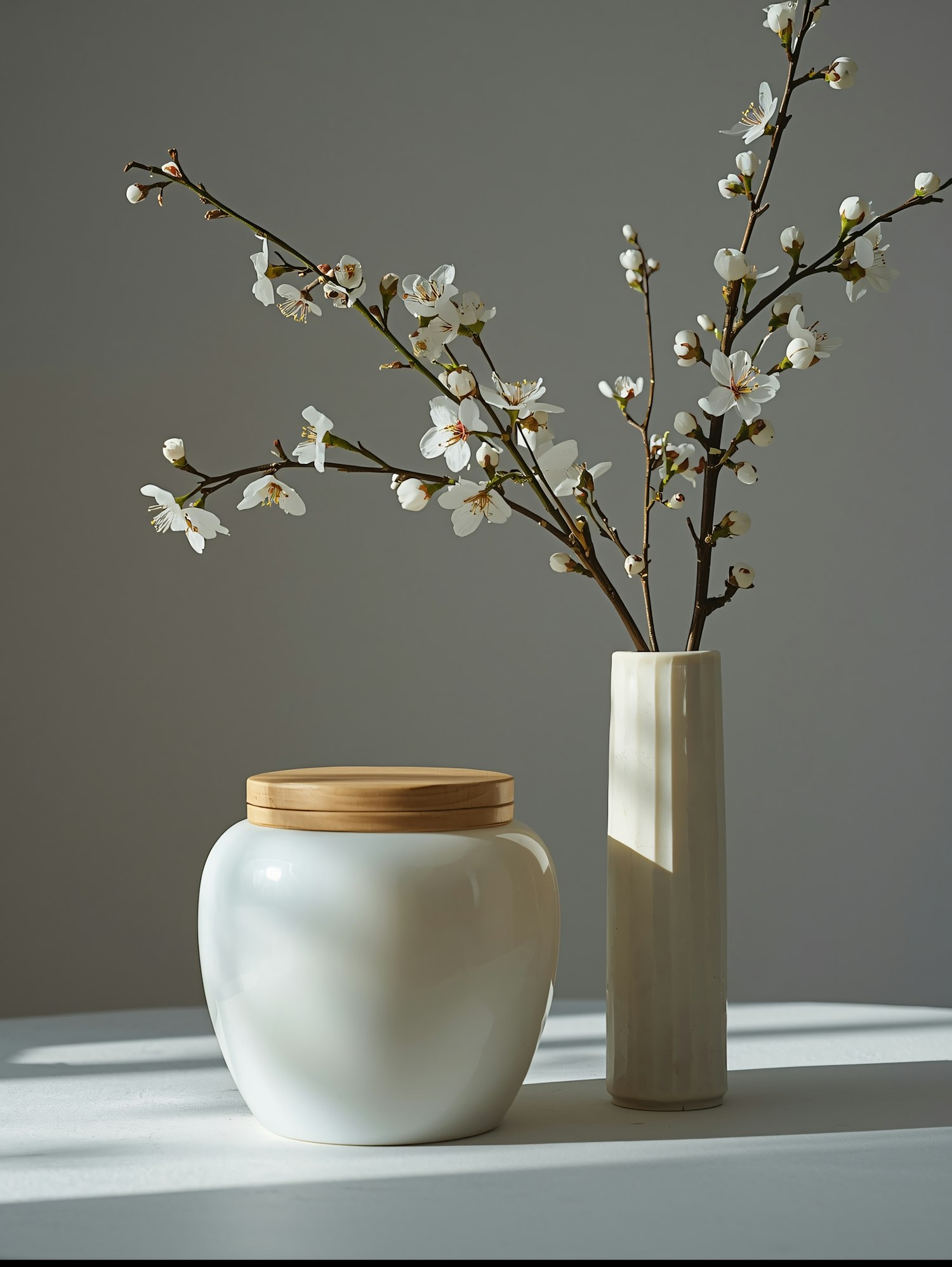 Minimalist decor with a white ceramic jar and a vase of delicate white blossoms, beautifully lit with soft natural light.